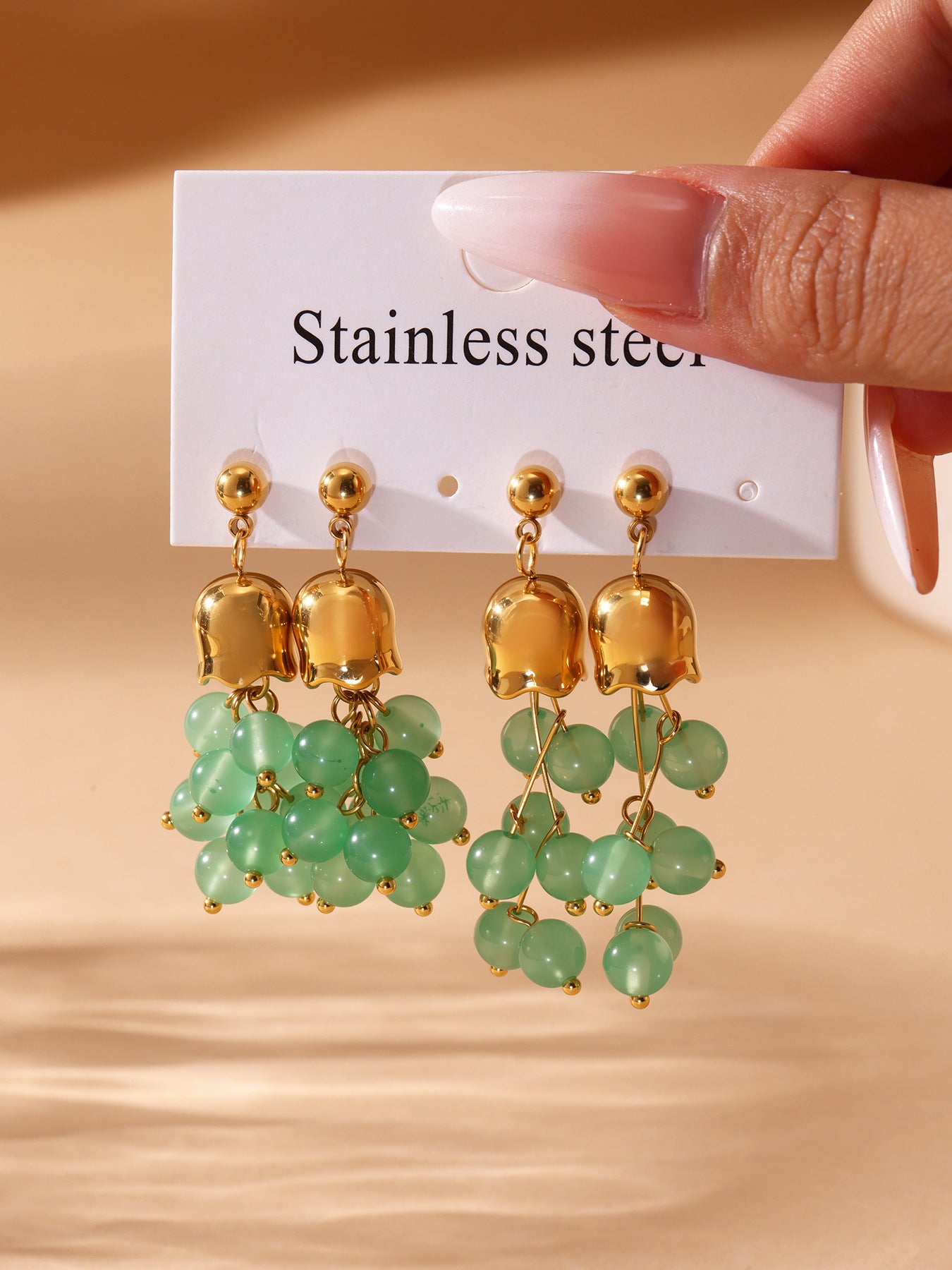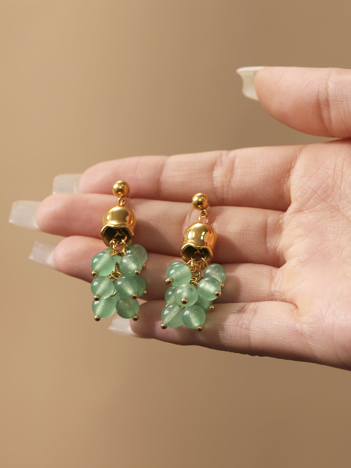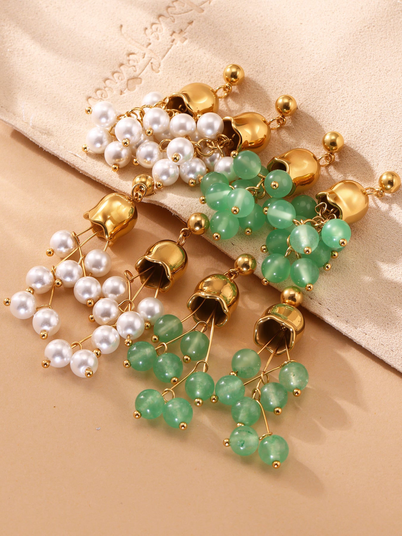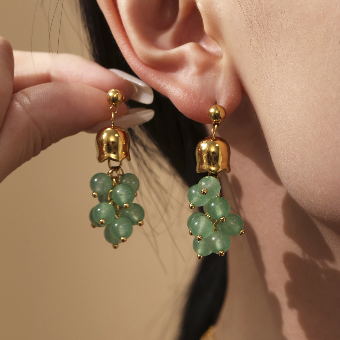 B廠【F1422】天然綠東陵石貝珠流蘇小葡萄造型耳環不鏽鋼18k鍍金耳環女 25.07-1