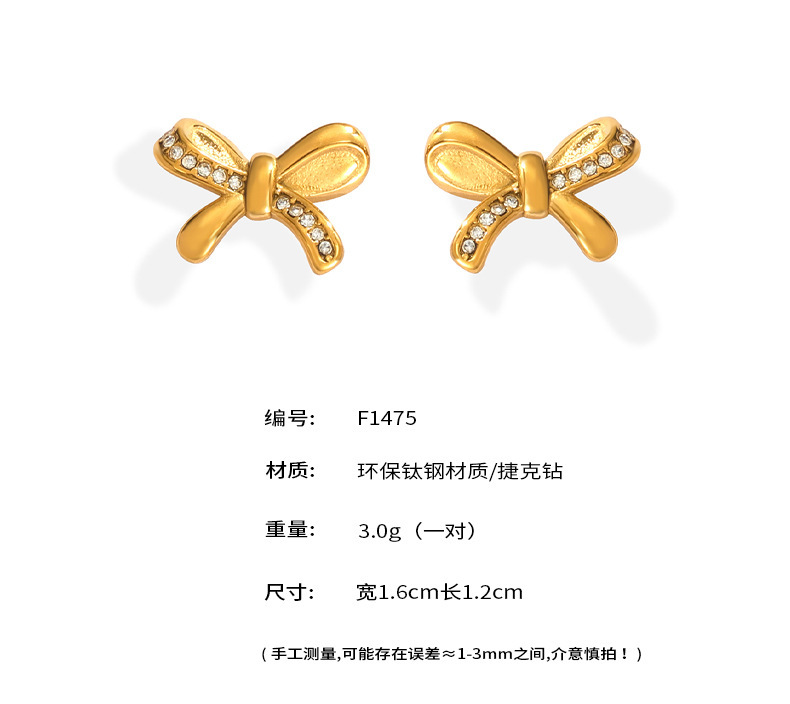 B廠【F1475】韓國版簡約單邊鑲鑽蝴蝶結耳環chic風鈦鋼鍍金耳環個性百搭保色耳飾 24.06-2