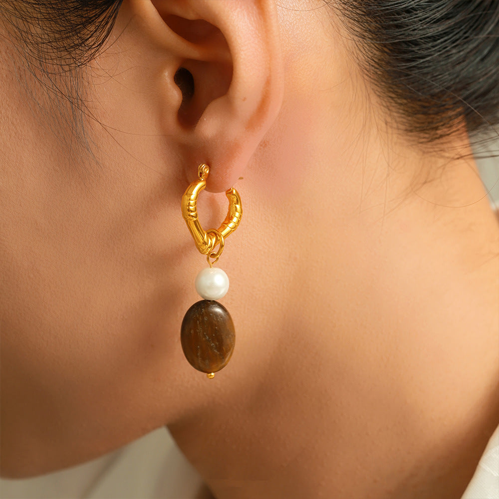 B廠【F1581】歐美跨境新款虎眼石串仿珍珠吊墜愛心耳環不鏽鋼鍍18k金小眾耳飾 24.08-4