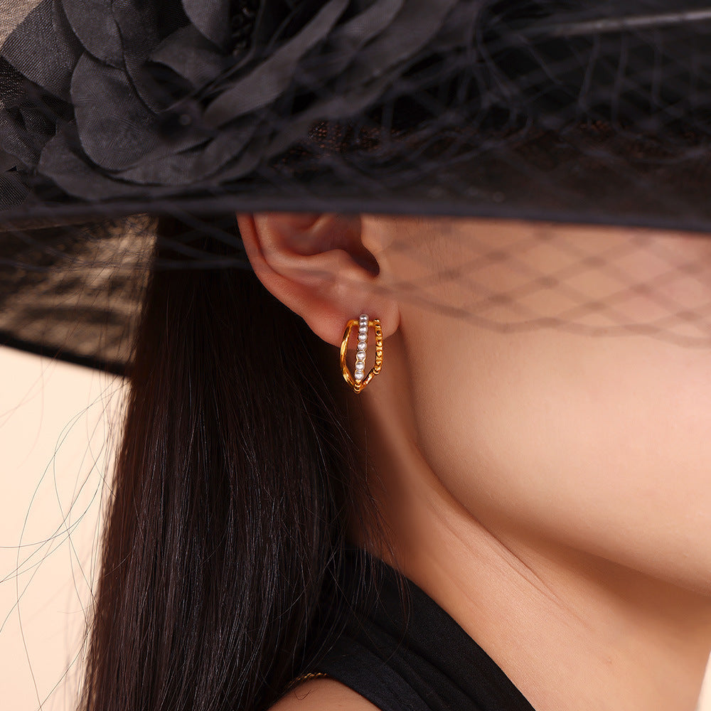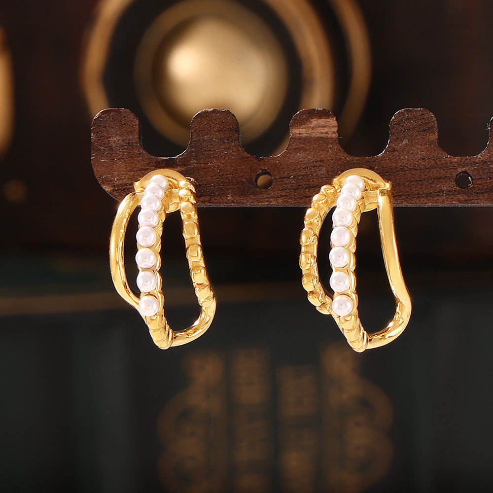 B廠【F1626】法式輕奢感耳飾 不鏽鋼鍍18k金幾何異形仿珍珠多層鏤空復古耳環女 24.09-2
