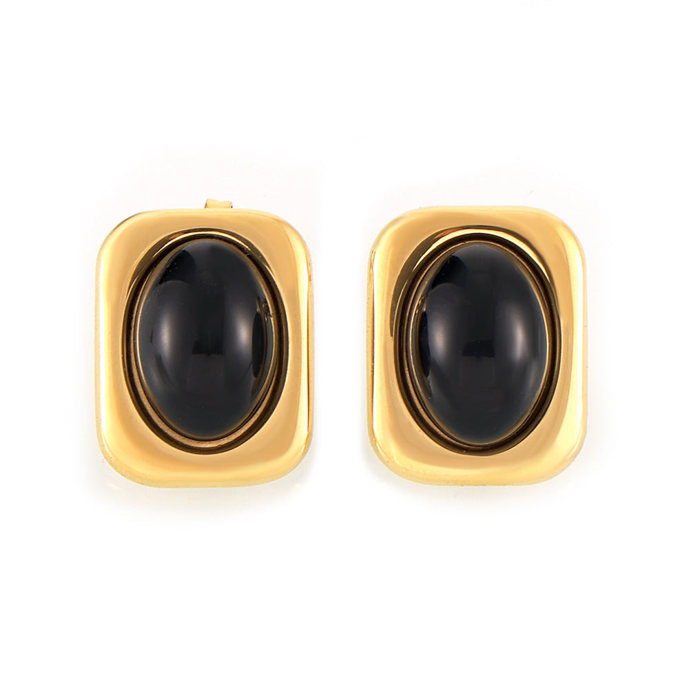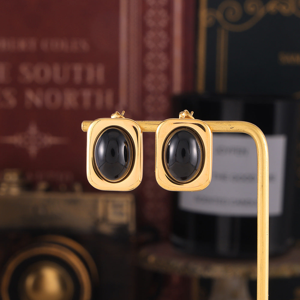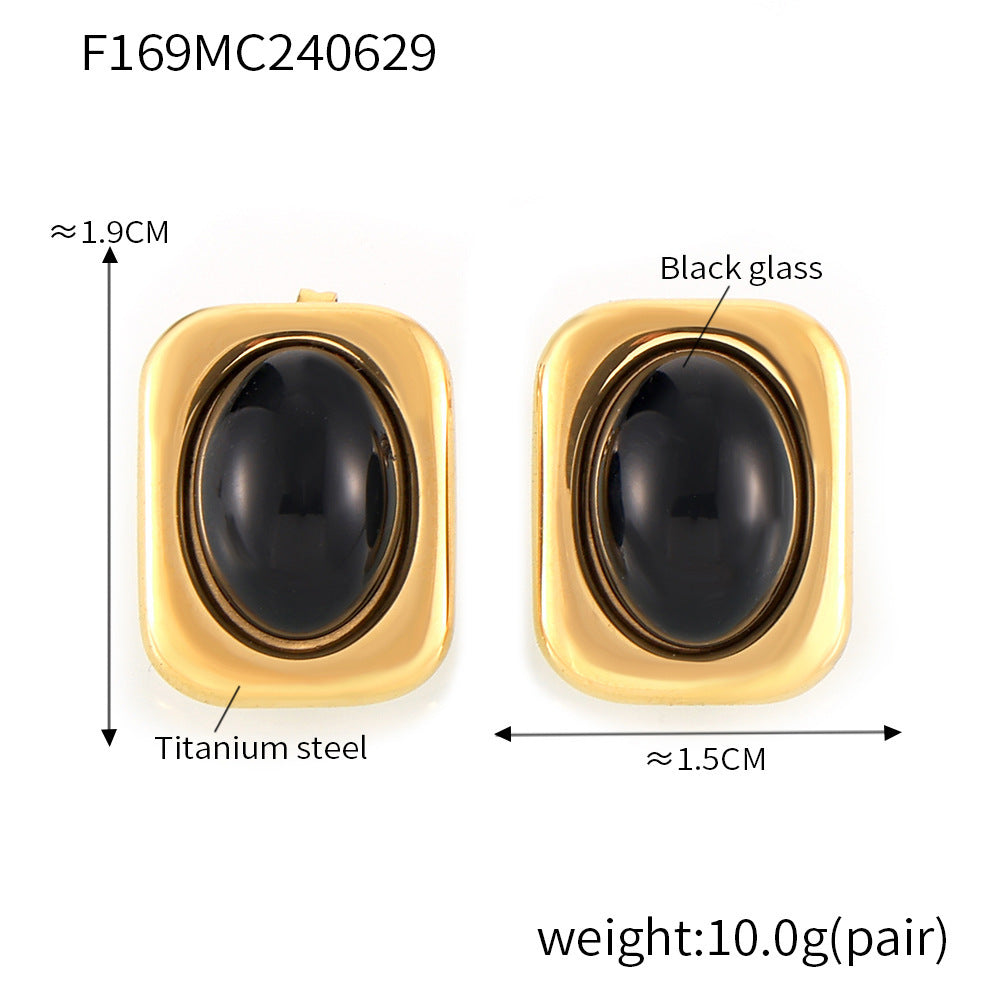B廠【F169】歐美跨國新款方形黑色玻璃耳環鈦鋼鍍18k真金小眾設計感耳環 24.07-1