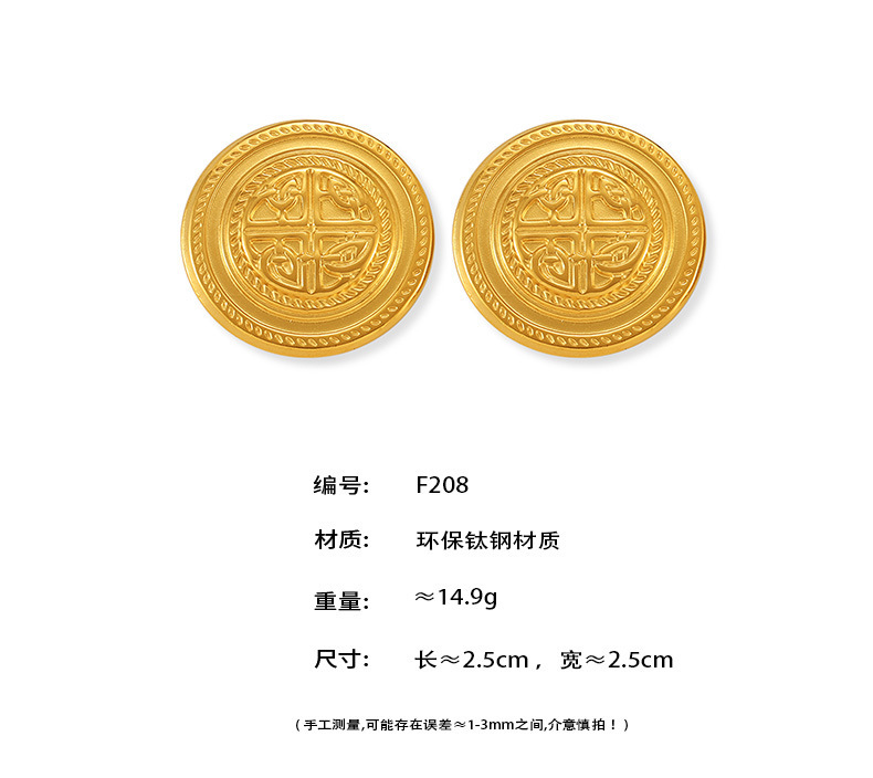 B廠【F208】歐美重工中古vintage冷淡風圓牌耳環復古設計鈦鋼鍍金百搭耳飾 24.07-3
