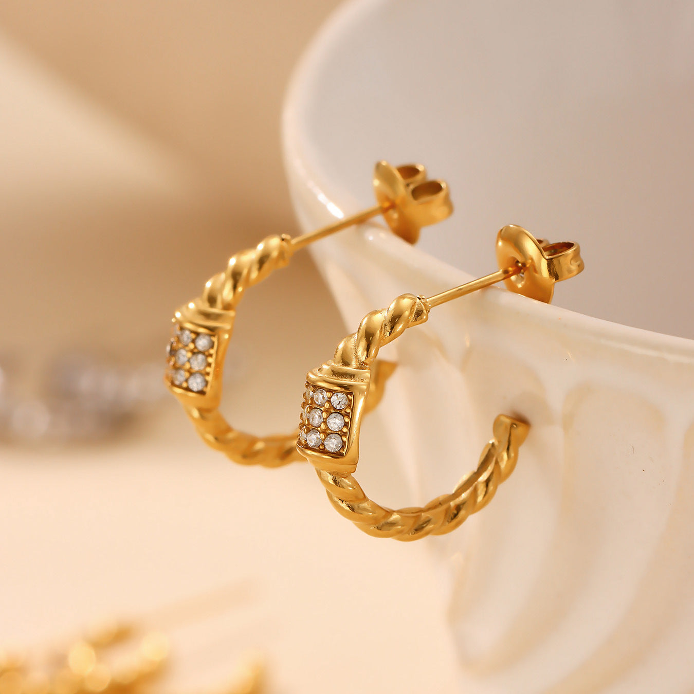 B廠【F374】超閃5A鋯石小鑽C型麻花線耳環飾品不鏽鋼18k鍍金不掉色耳飾 25.06-3