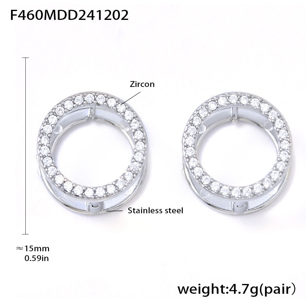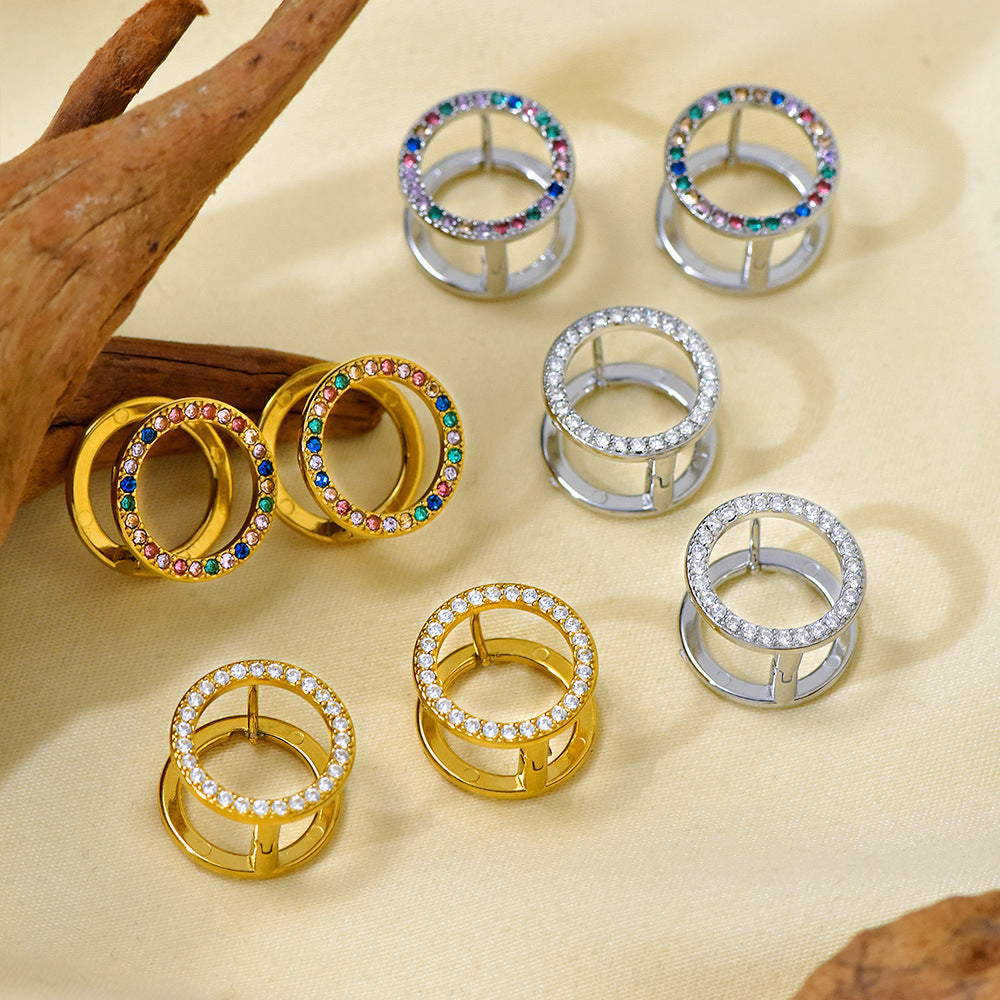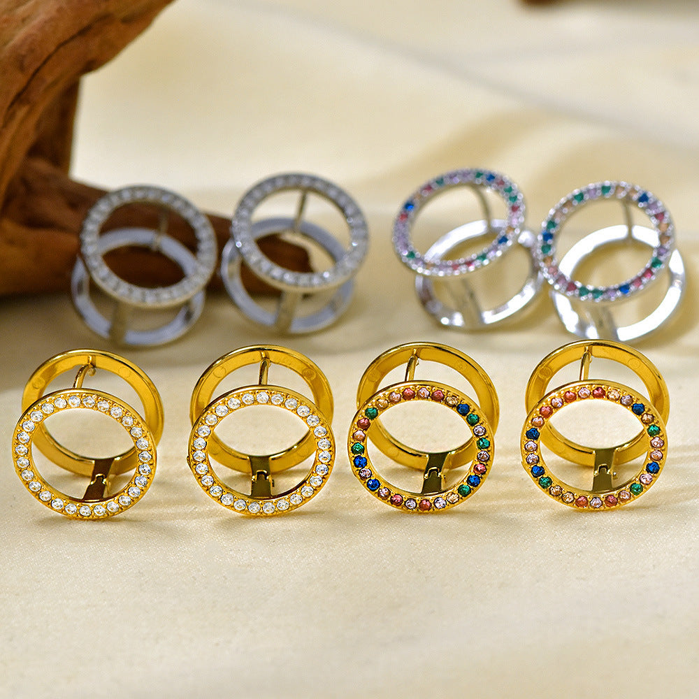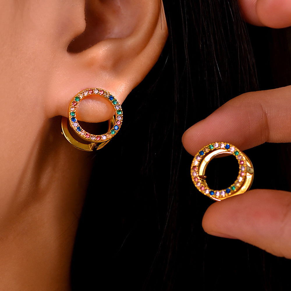 B廠【F460】不鏽鋼混彩鋯石雙面耳環輕奢質感PVD鍍真金精緻圓耳飾女 24.12-1