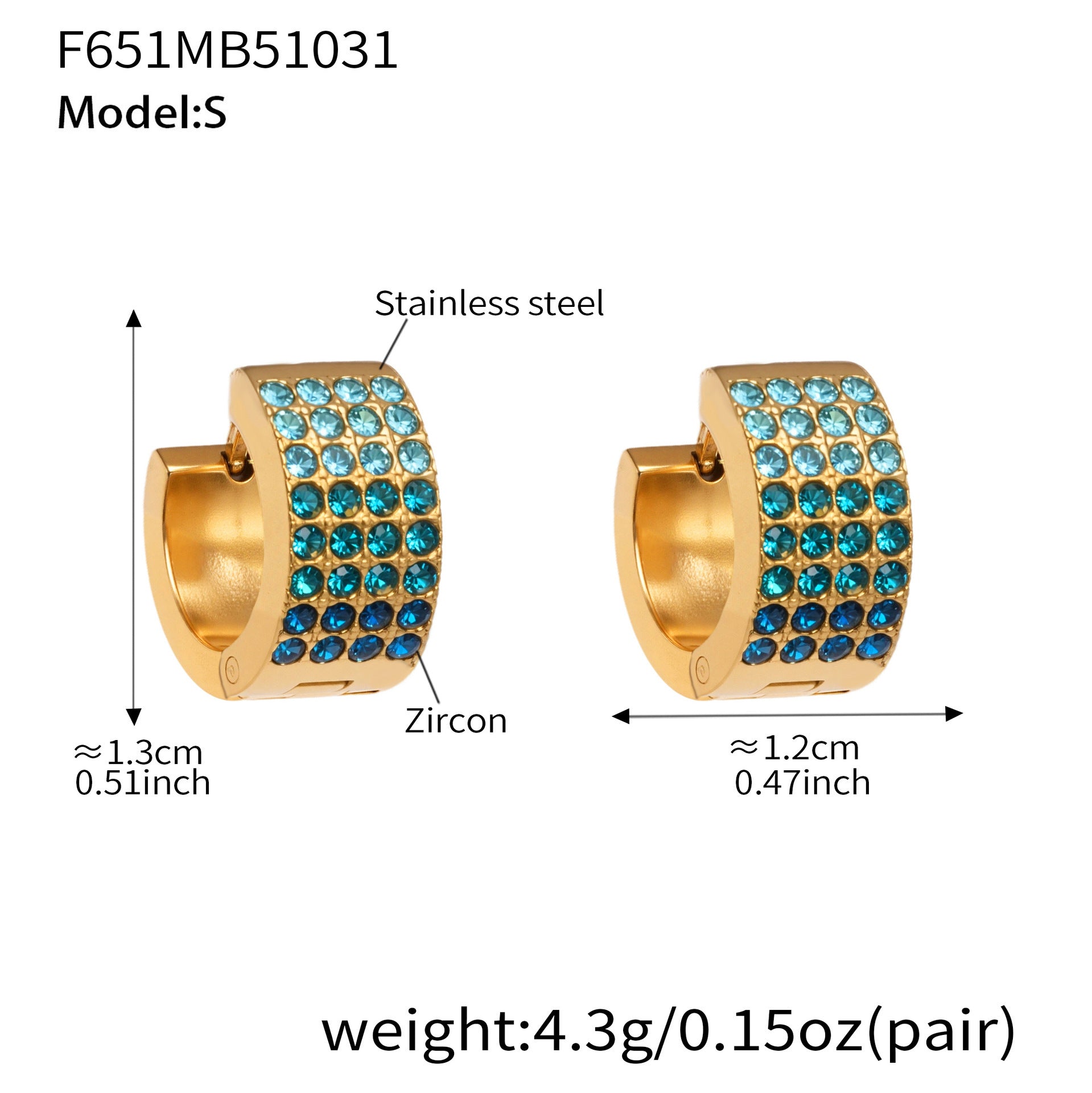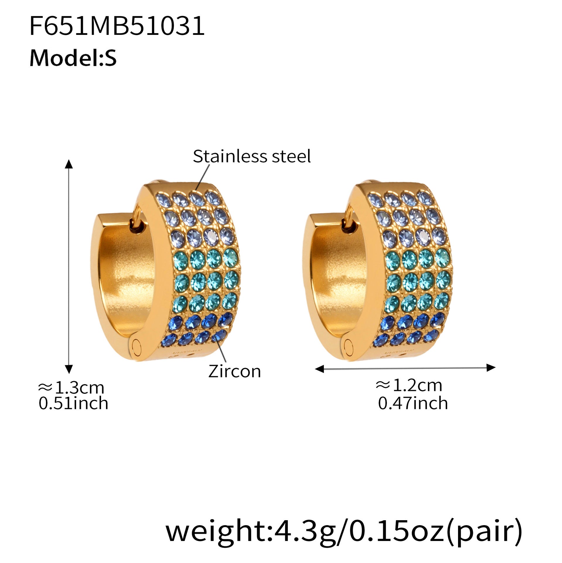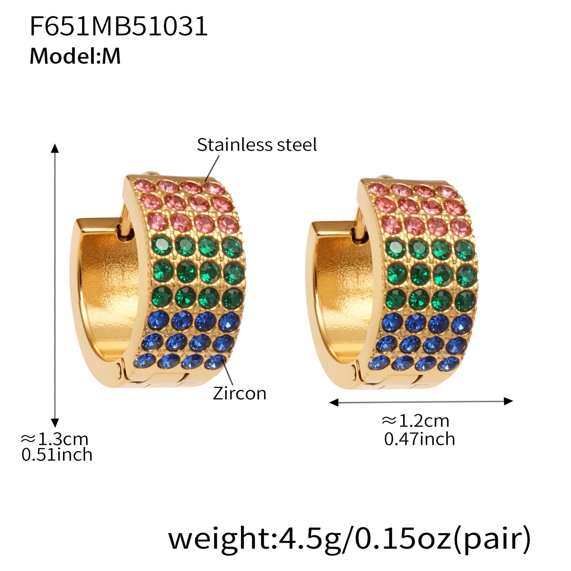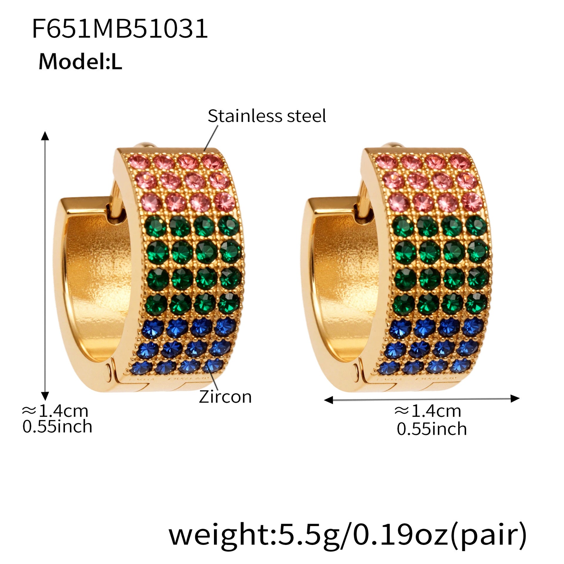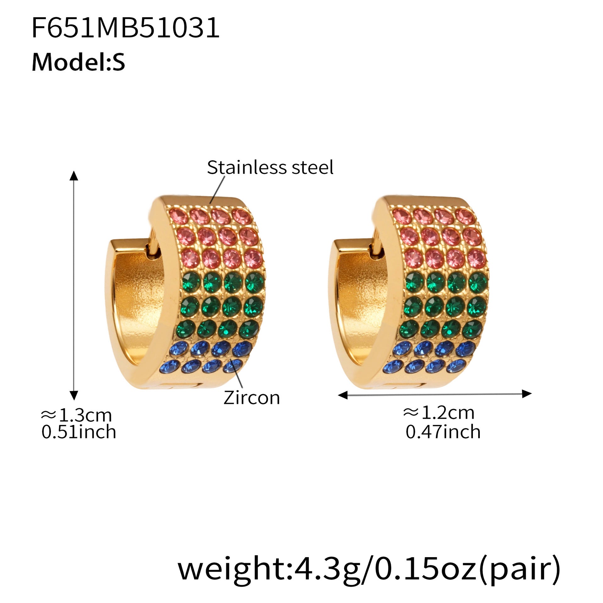 B廠【F651】彩鑽四排鋯石精緻卡扣耳環不鏽鋼鍍18k金時尚百搭個性耳飾 25.11-1