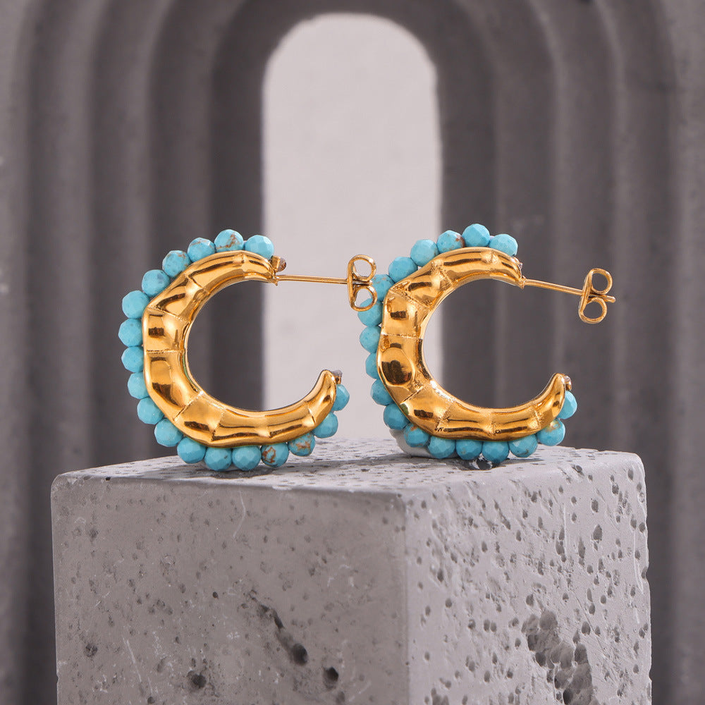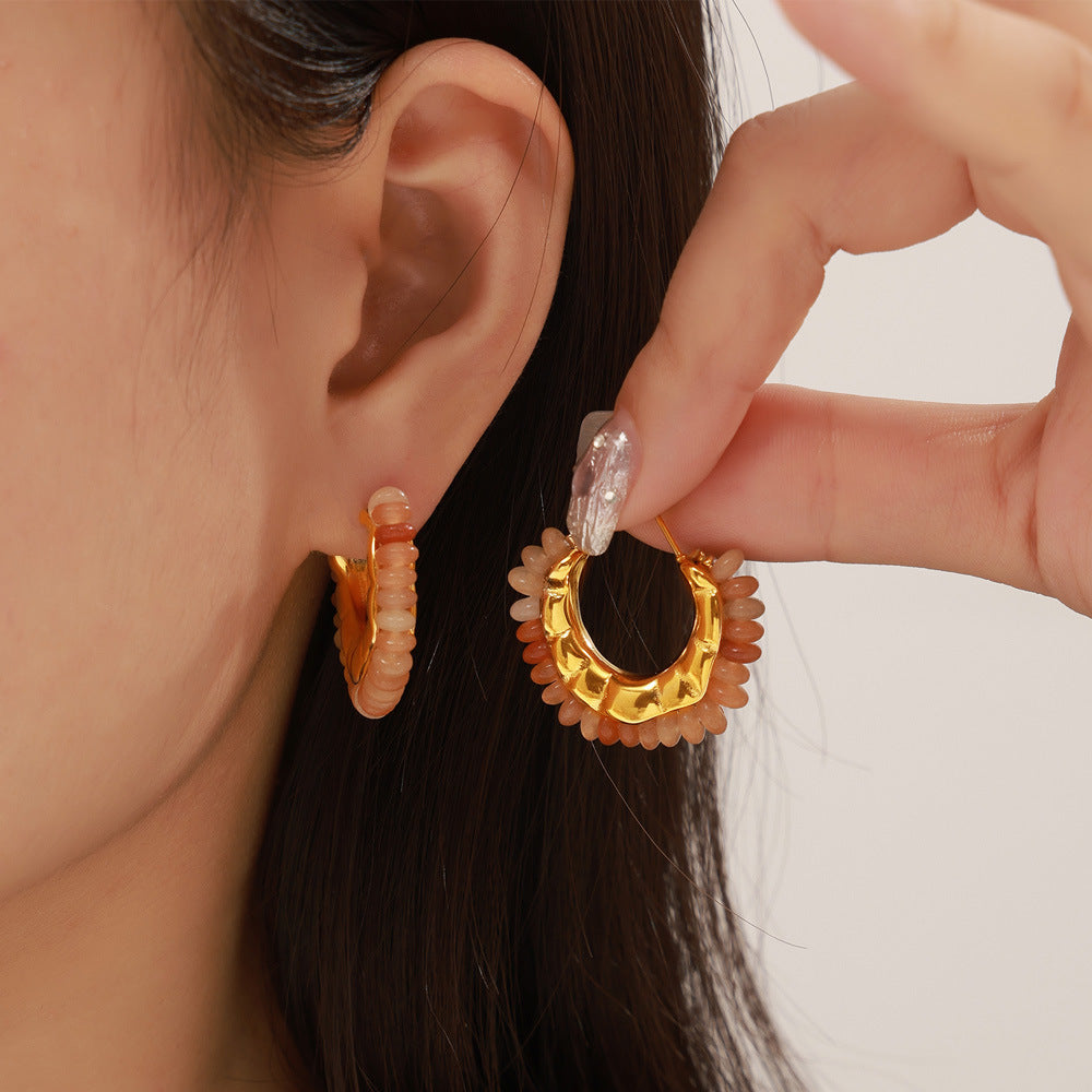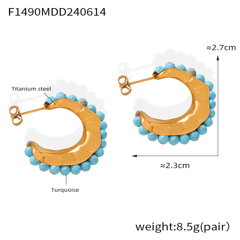 B廠【F976】歐美復古彩色天然石手工串珠耳環時尚小眾百搭鈦鋼C型鍍18k金耳飾 24.06-3