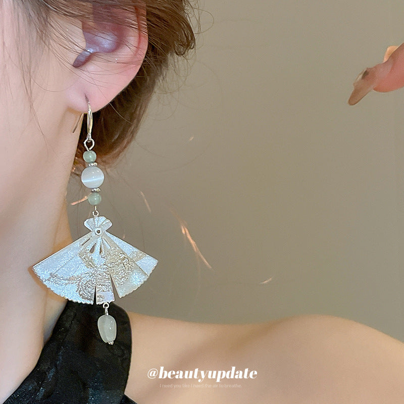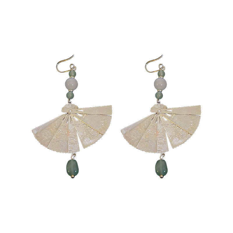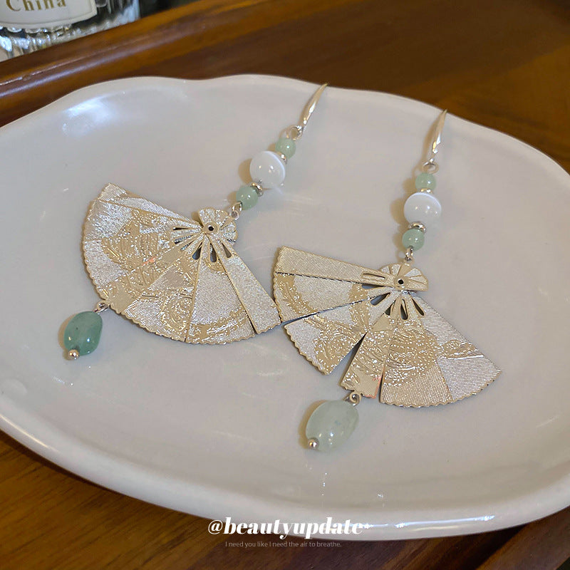 A廠【HE19206】全新中式扇子幾何玉石耳環中國風復古長版耳環小眾時尚簡約耳飾 24.03-4