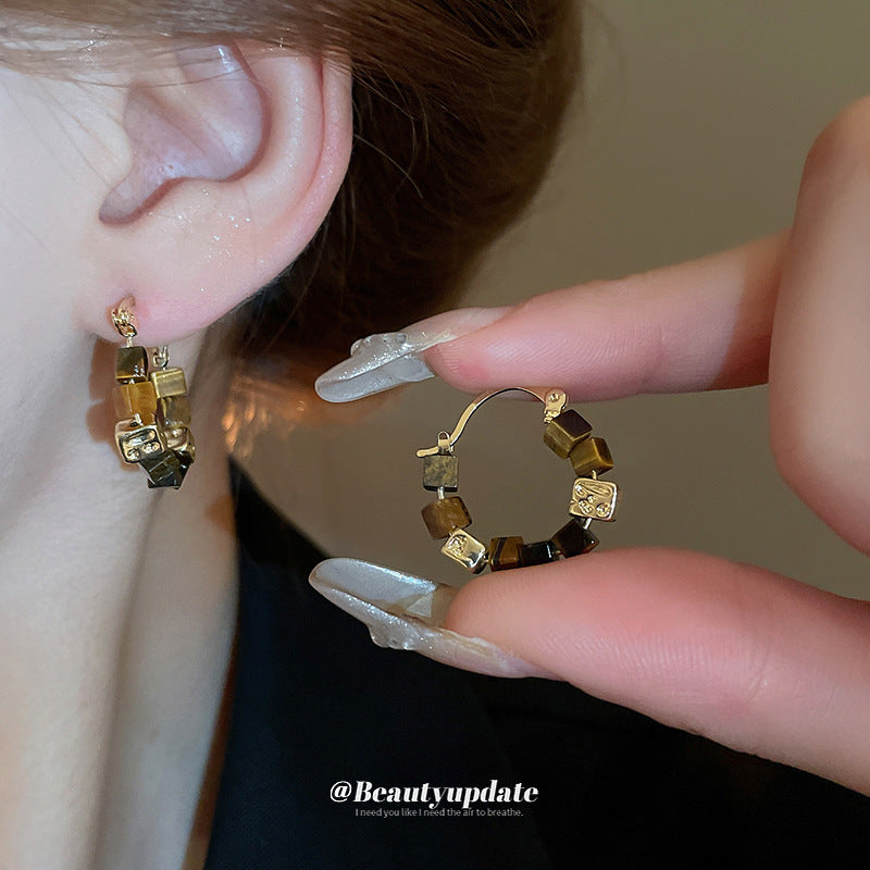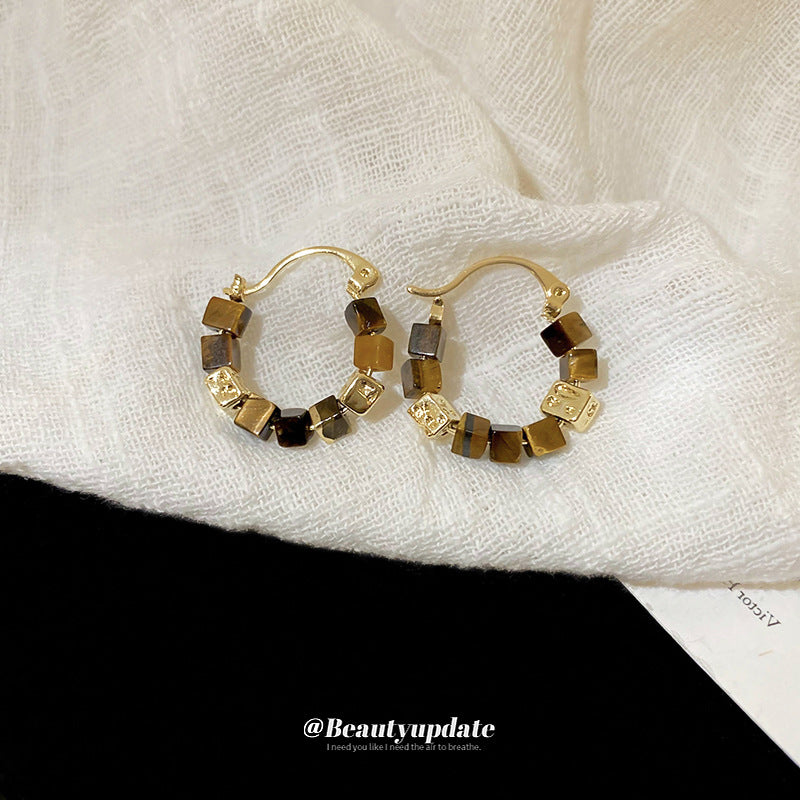 A廠【HE21117】真金電鍍方形虎眼石串珠耳環時尚輕奢氣質耳環簡約高級感復古耳環 24.06-4