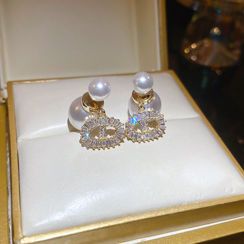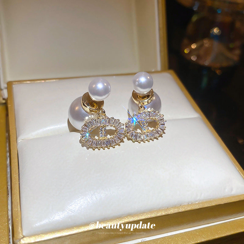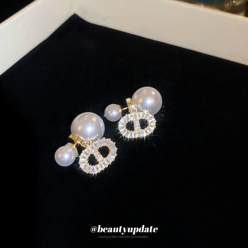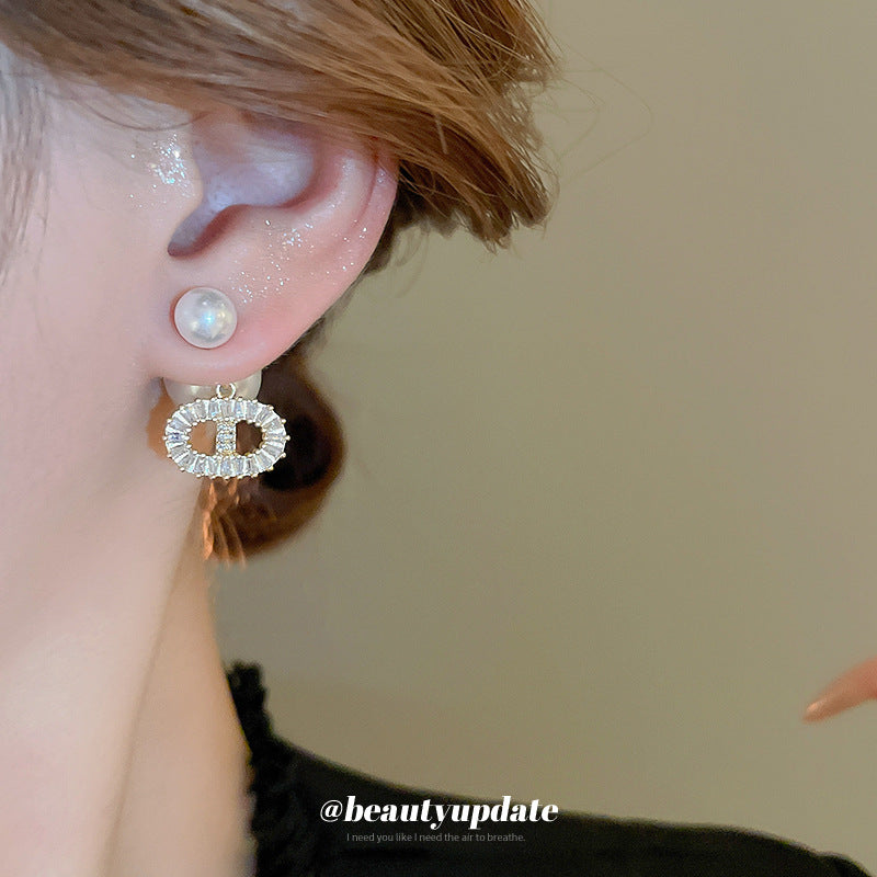 A廠【HE21956】真金電鍍925銀針歐美豬鼻子鋯石珍珠雙面帶耳環精緻時尚耳環耳環 24.08-4
