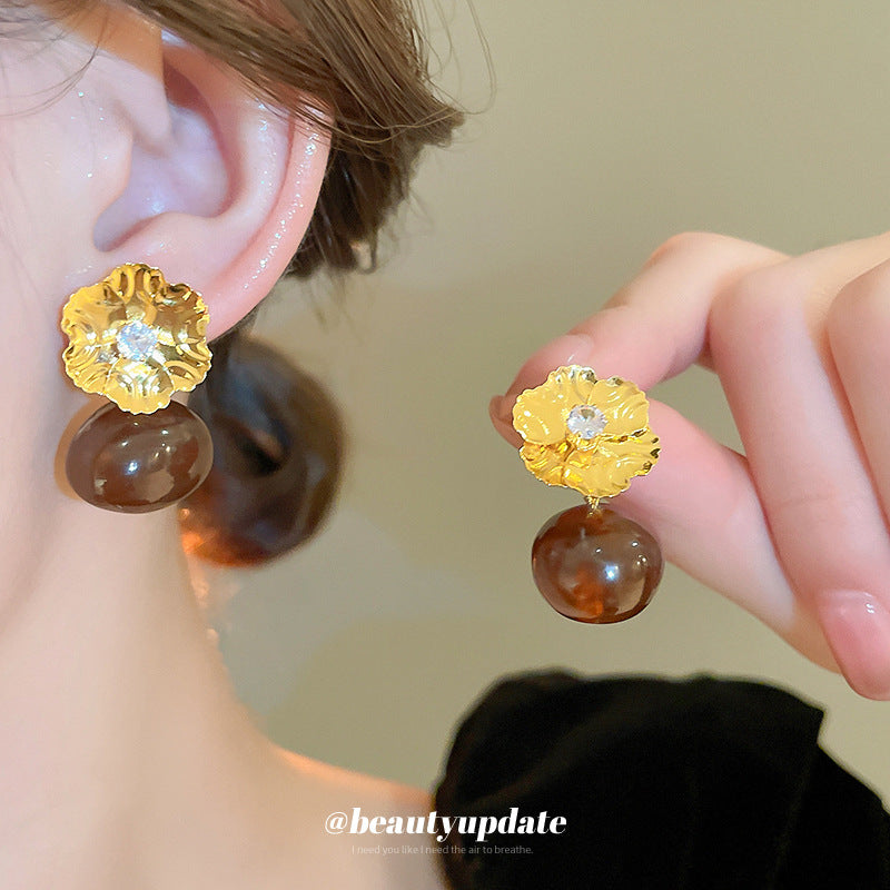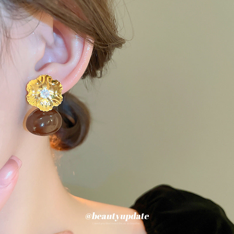 A廠【HE22447】925銀針復古撞色鑲鑽花朵耳環vintage氣質百搭耳環個性高級感耳飾女 24.09-3