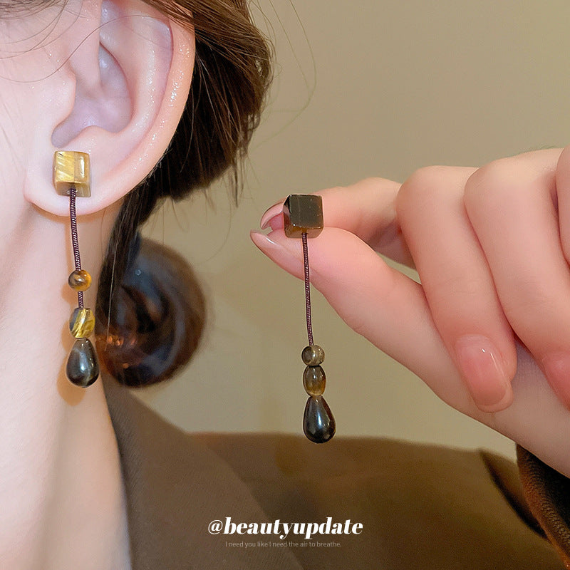 A廠【HE22450】925銀針人造虎眼石方圓吊墜耳環民族風復古耳環中古風氣質百搭耳環 24.09-3