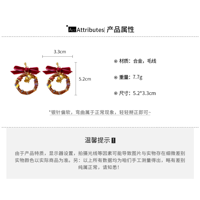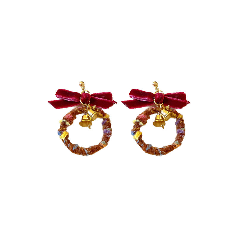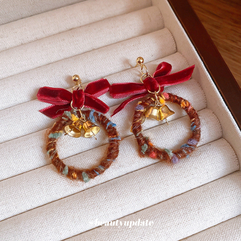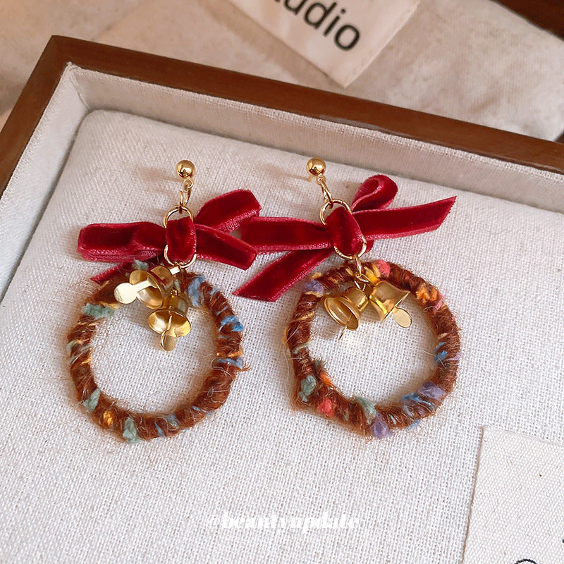 A廠【HE23652】925銀針毛線聖誕節蝴蝶結鈴鐺耳環復古時尚耳環女高級感氣質耳環秋冬 24.11-3