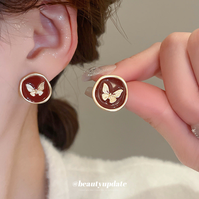 A廠【HE24039】925銀針安可拉紅色滴油蝴蝶耳環復古時尚百搭耳環輕奢高級感耳飾秋冬 24.12-1