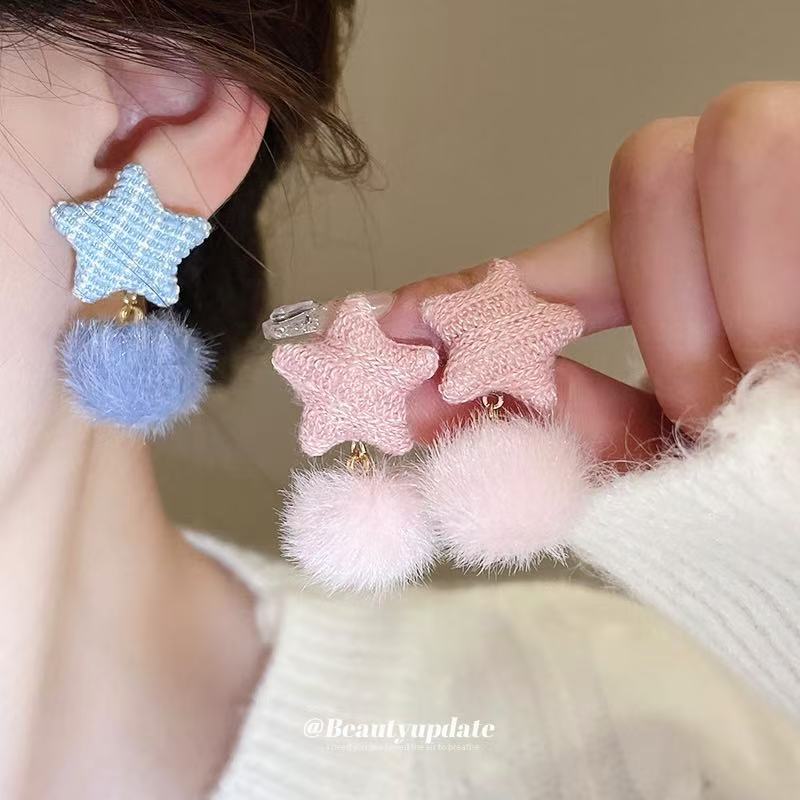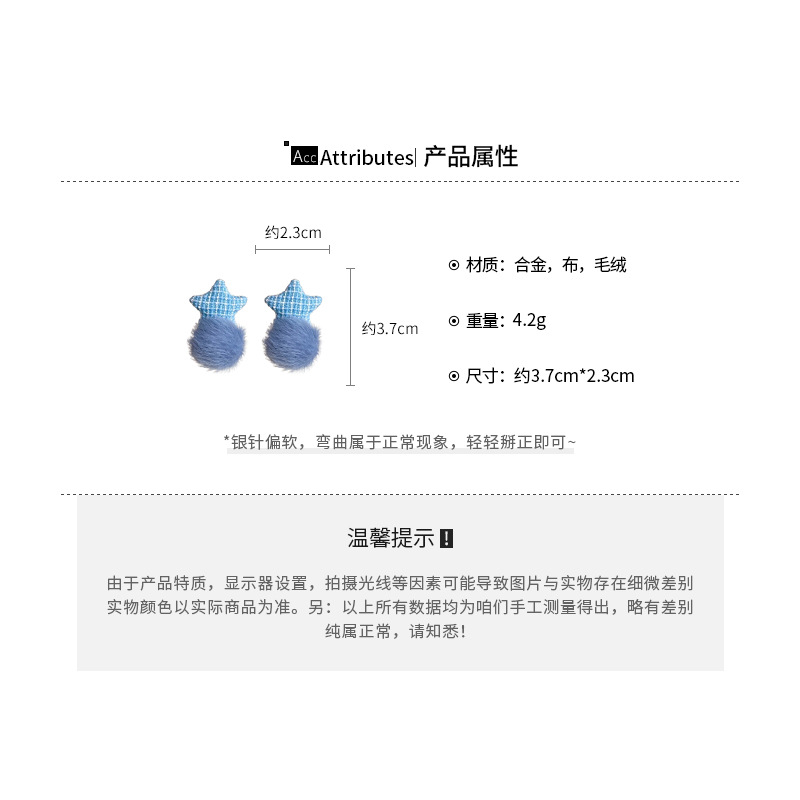 A廠【HE24208】925銀針小清新格紋星星毛絨耳環女少女心耳環小眾百搭耳飾秋冬高級感 24.12-2