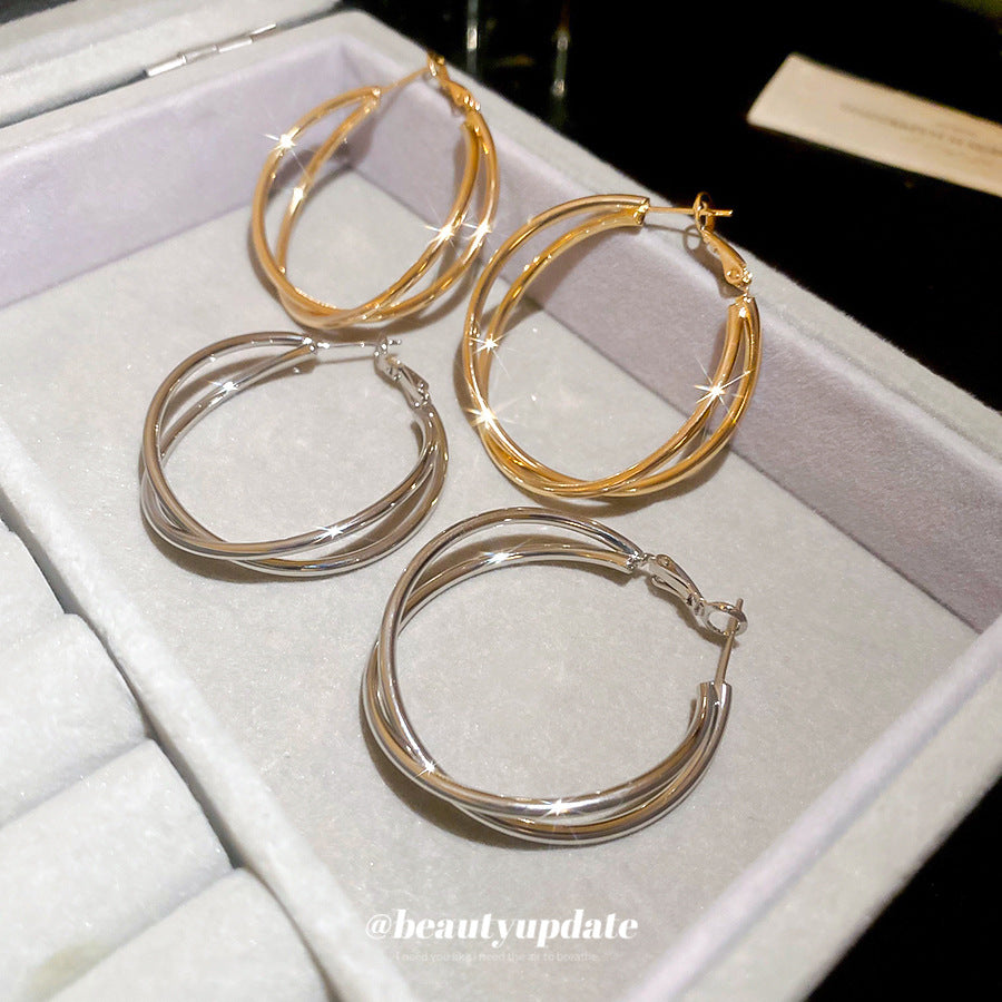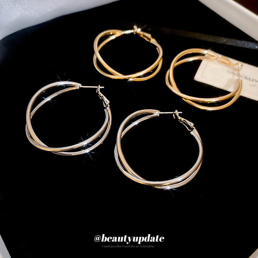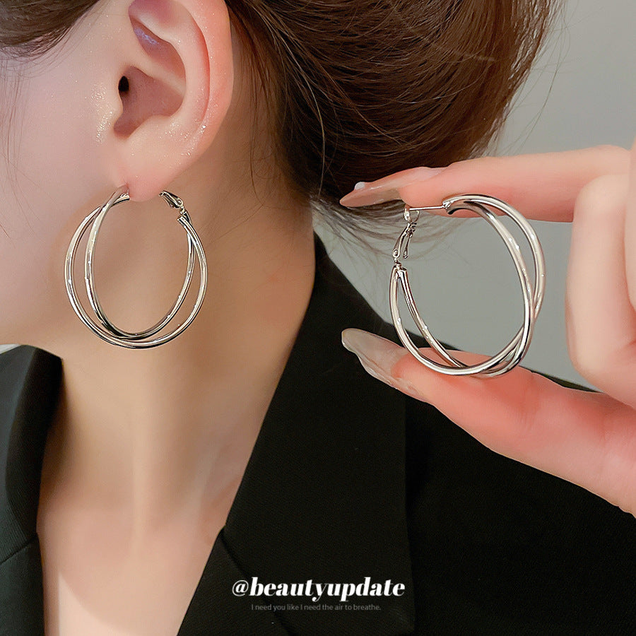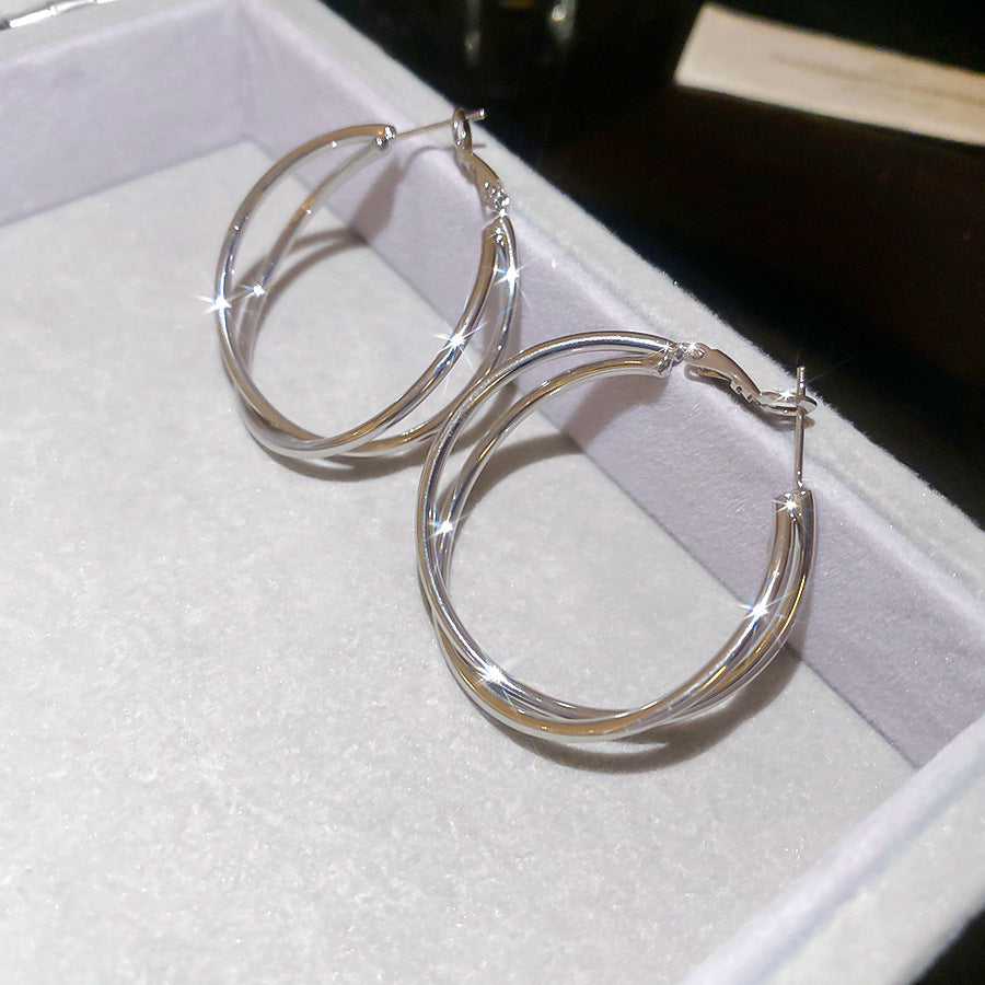 A廠【HE27215】925銀針光面雙層交叉圓形耳圈歐美時尚百搭耳環個性耳飾設計感小眾女 25.06-3