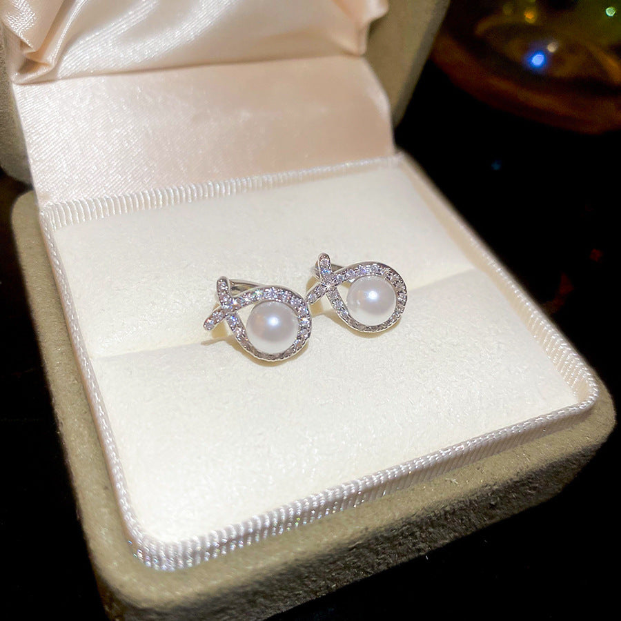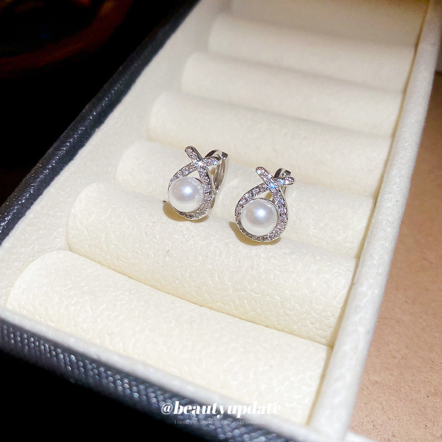 A廠【HE27439】鋯石交叉水滴珍珠耳扣簡約耳環耳環輕奢高級感耳飾設計感小眾 25.06-4