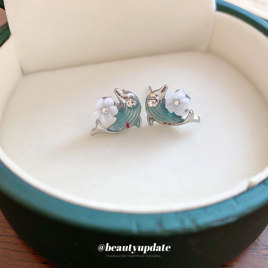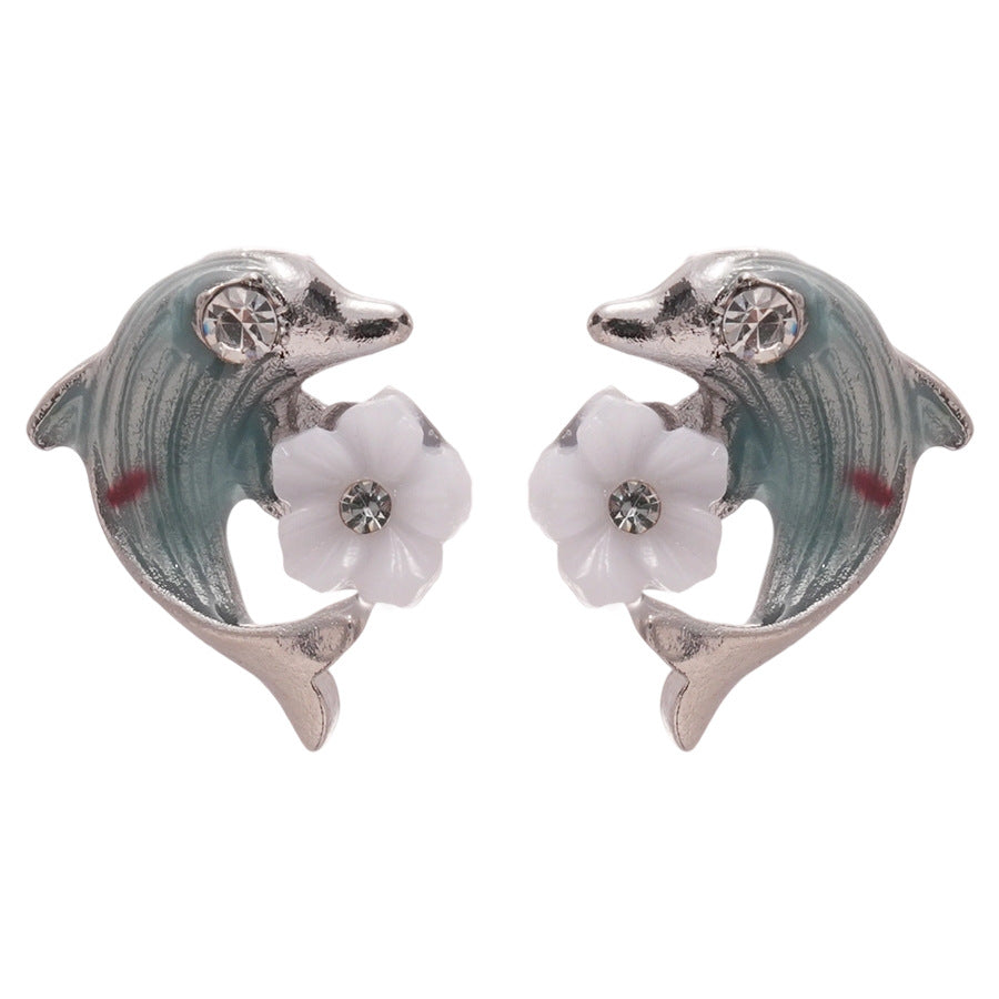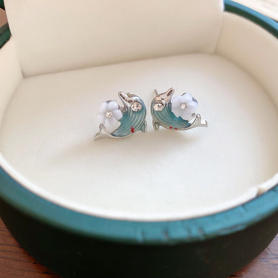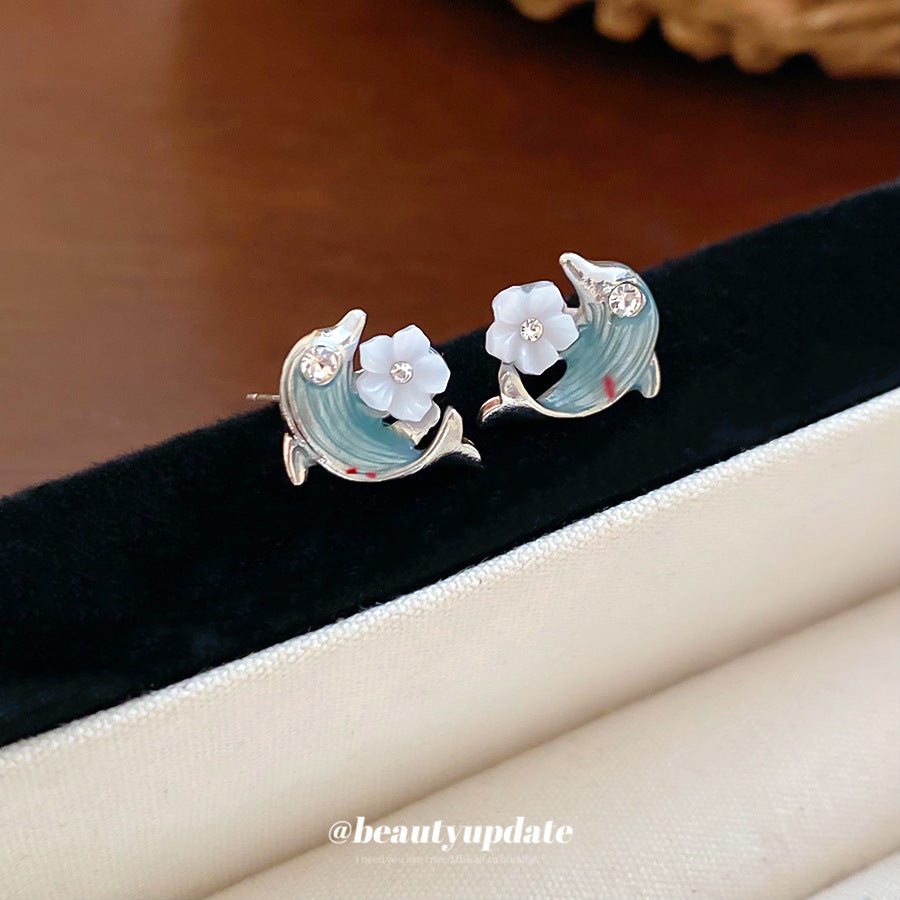 A廠【HE28124】925銀針鑲鑽滴油海豚花朵耳環時尚百搭海邊度假風耳環輕奢高級感耳飾 25.08-2