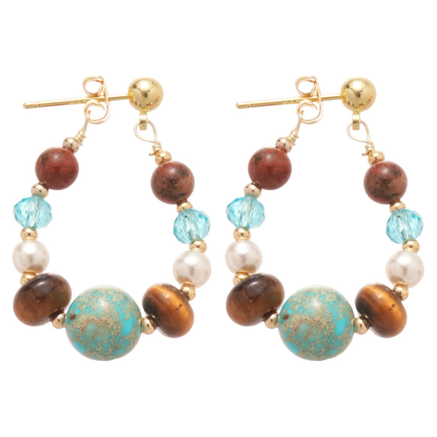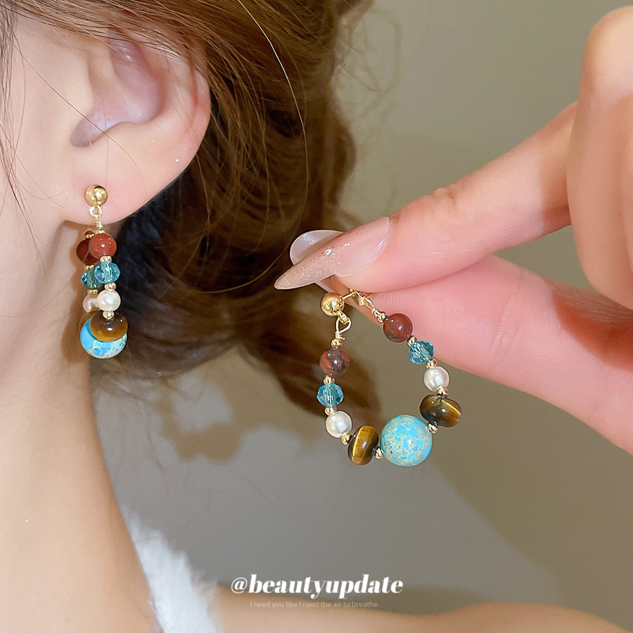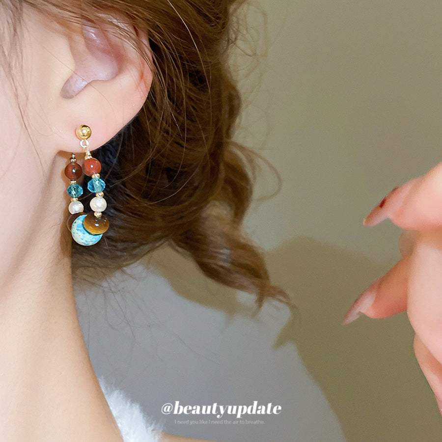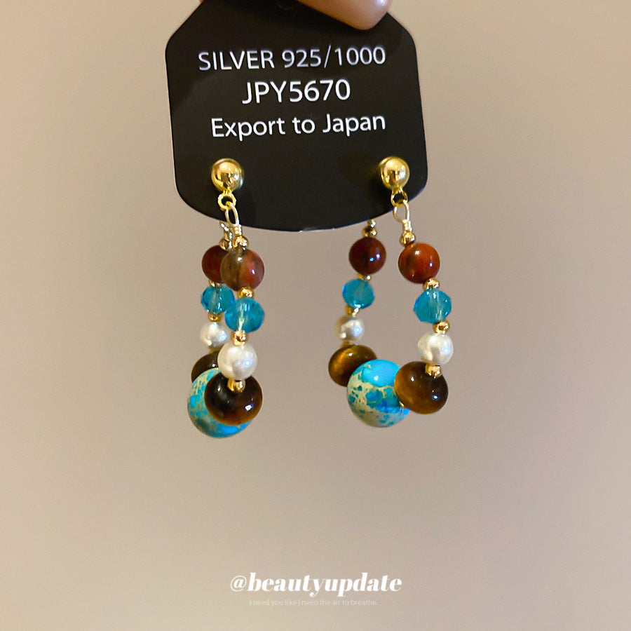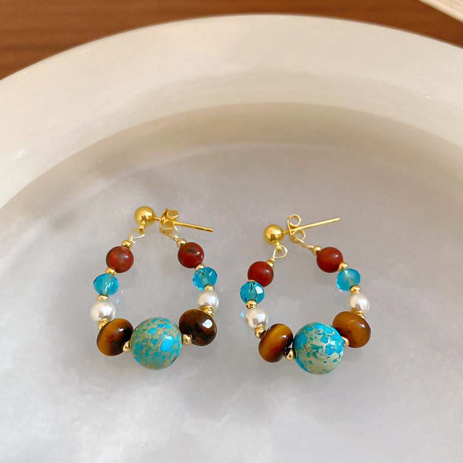 A廠【HE28342】925銀針石頭水晶珍珠圓形串珠吊墜耳環復古民族風耳環小眾設計感耳飾 25.09-1