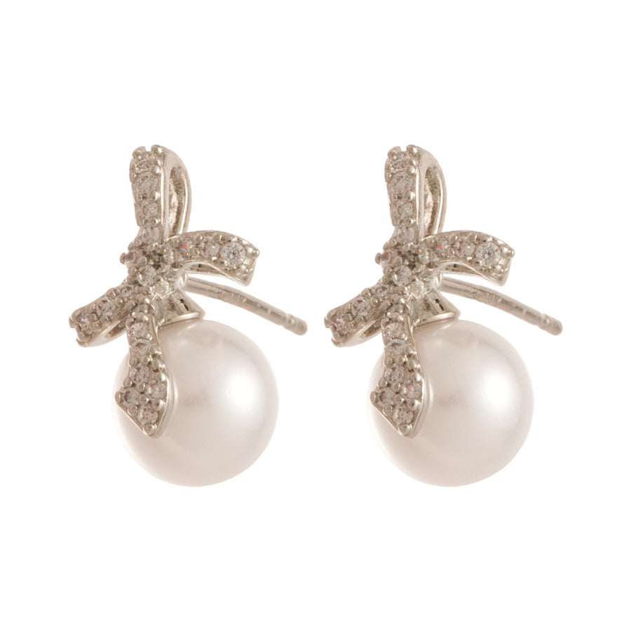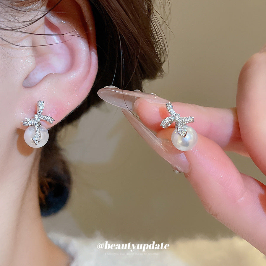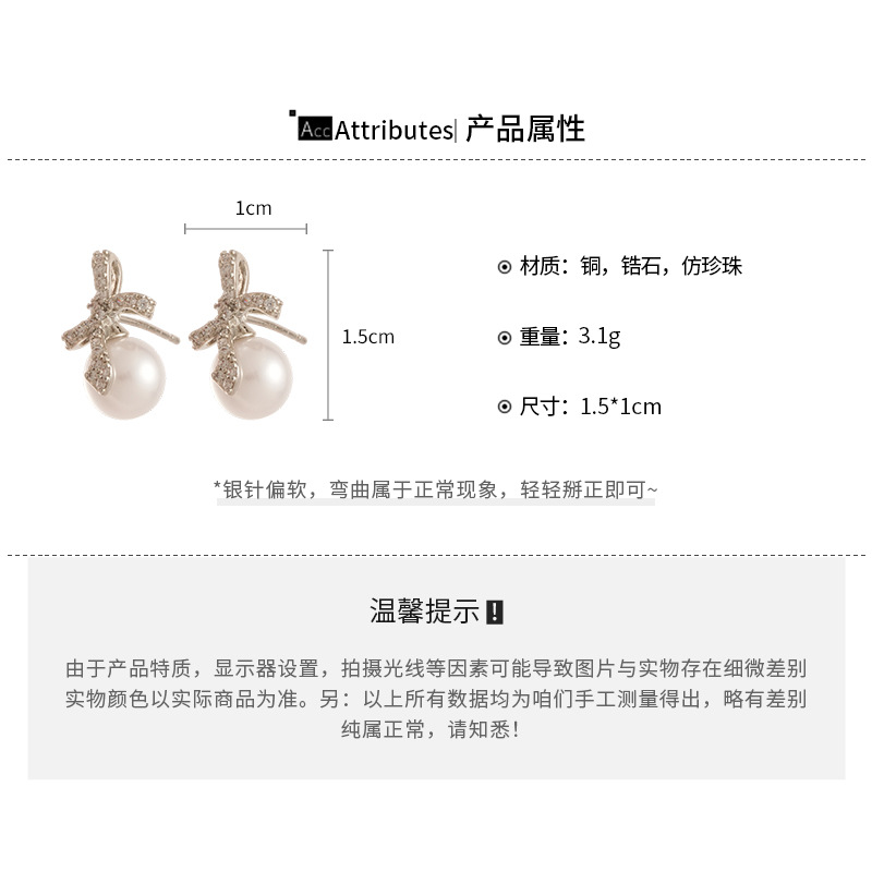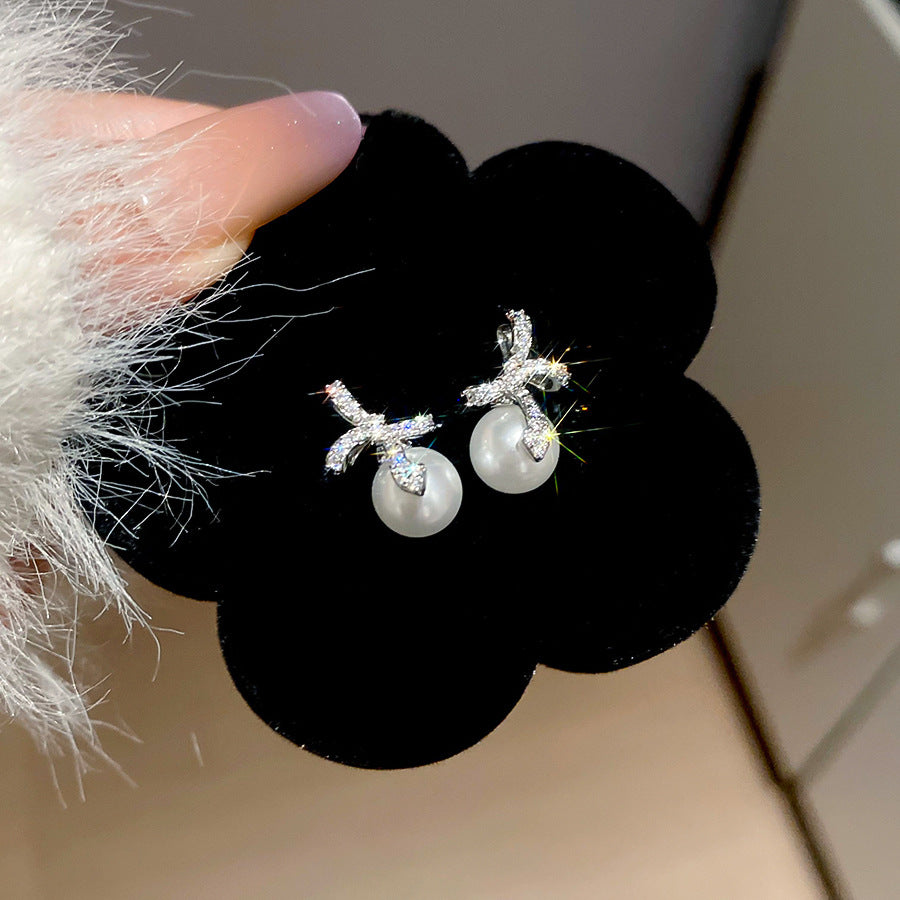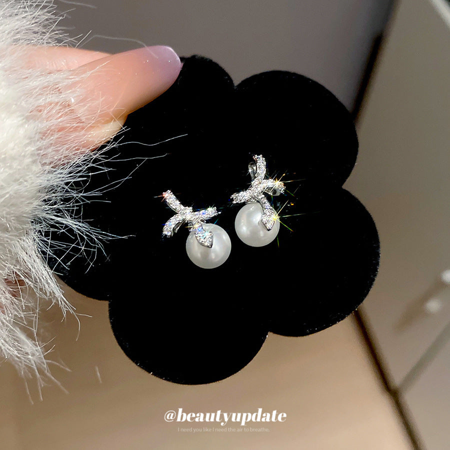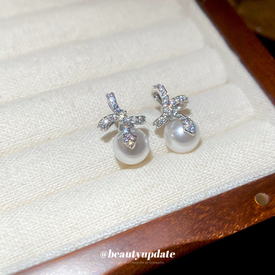 A廠【HE28946】925銀針超閃鋯石蝴蝶結珍珠吊墜耳環時尚百搭耳環精緻輕奢高級感耳飾 25.10-3