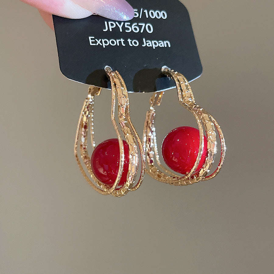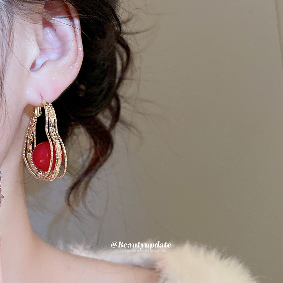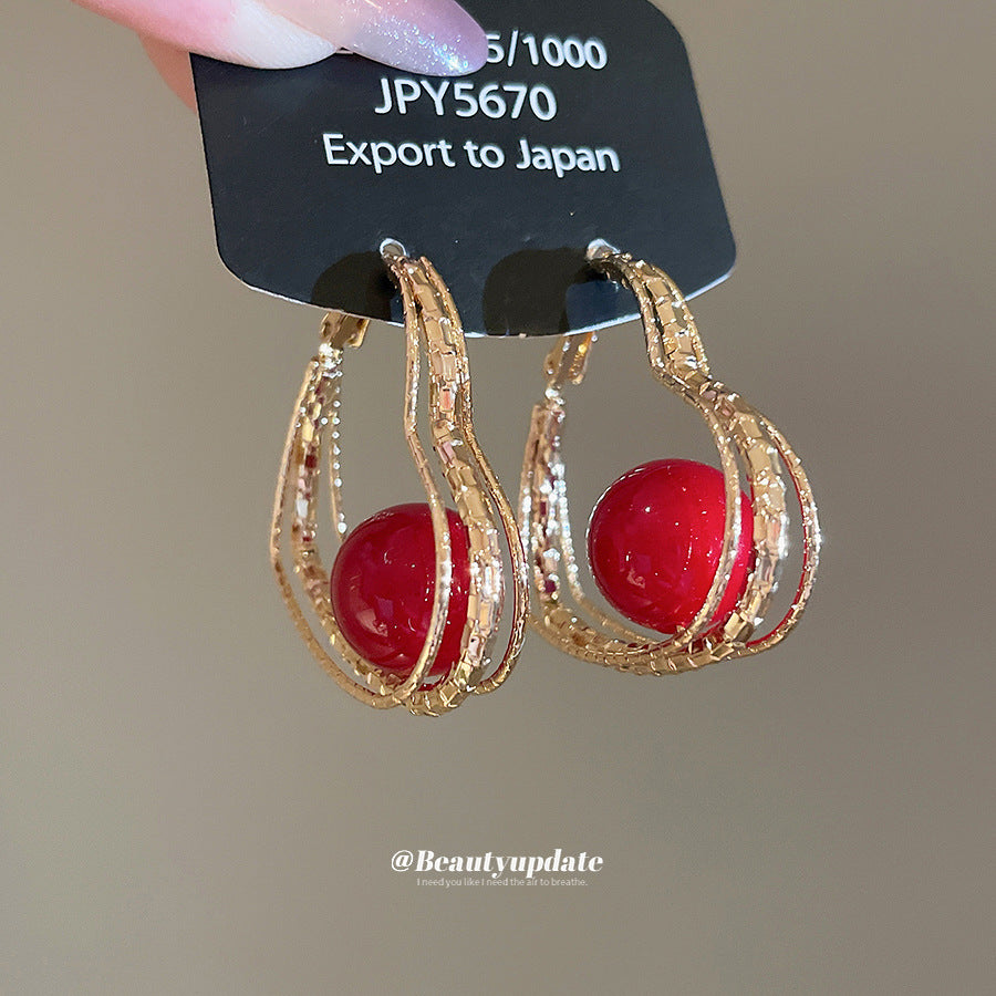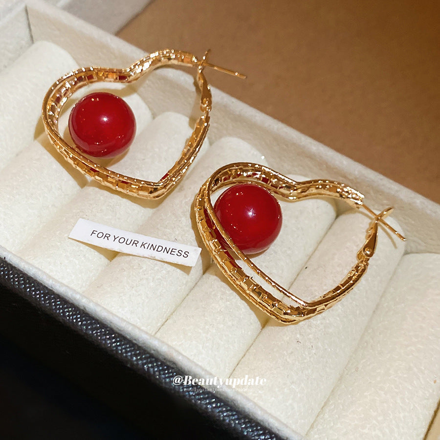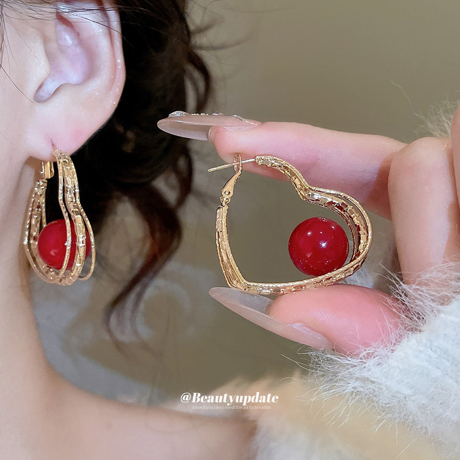 A廠【HE28963】925銀針紅色多層愛心圓球耳圈復古港風耳環耳環輕奢高級感耳飾女 25.10-4