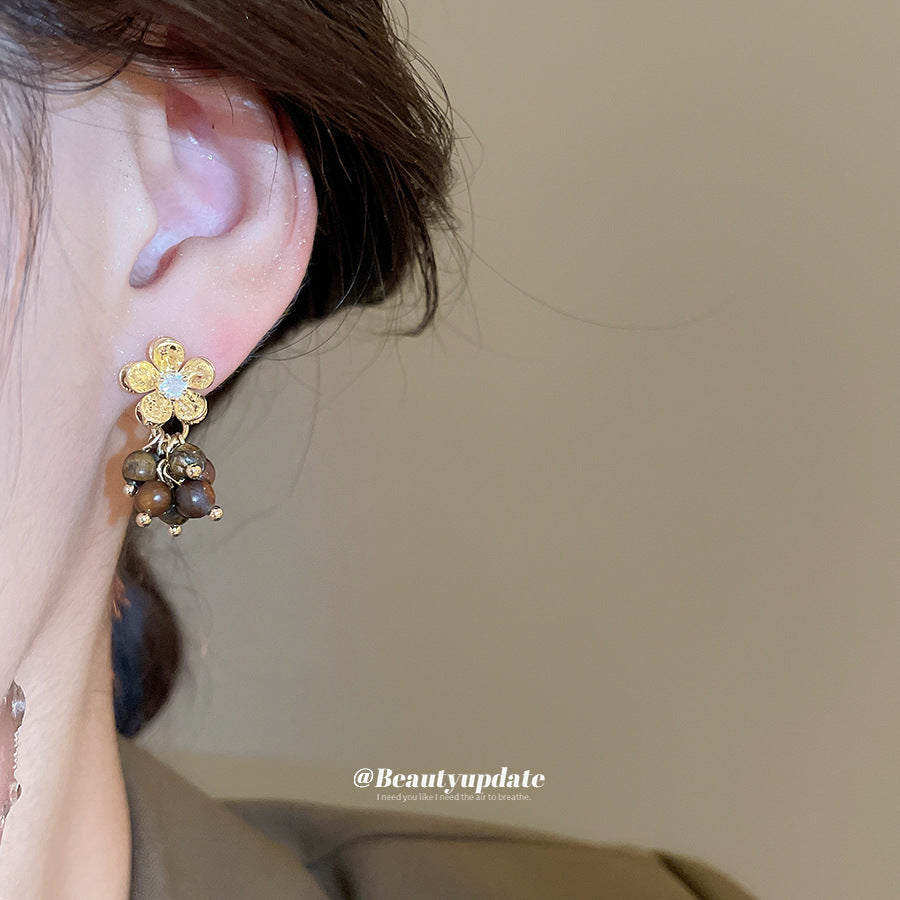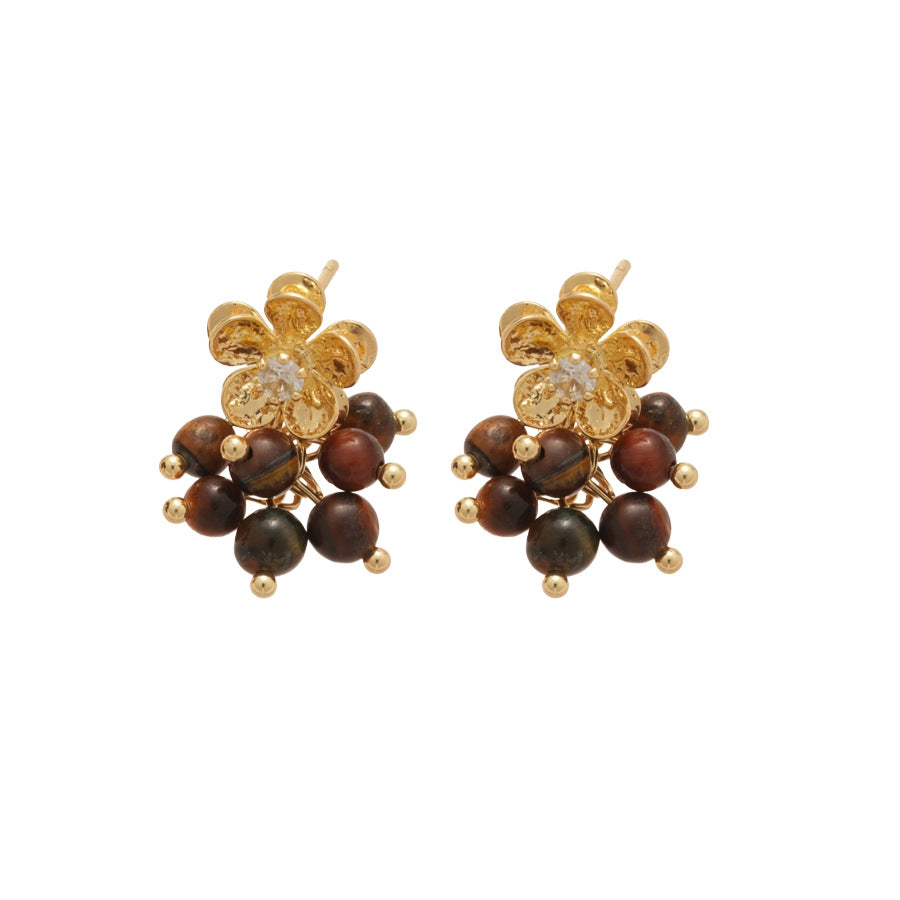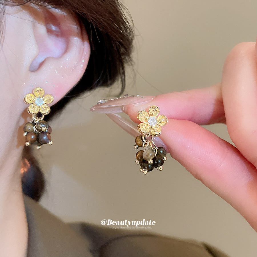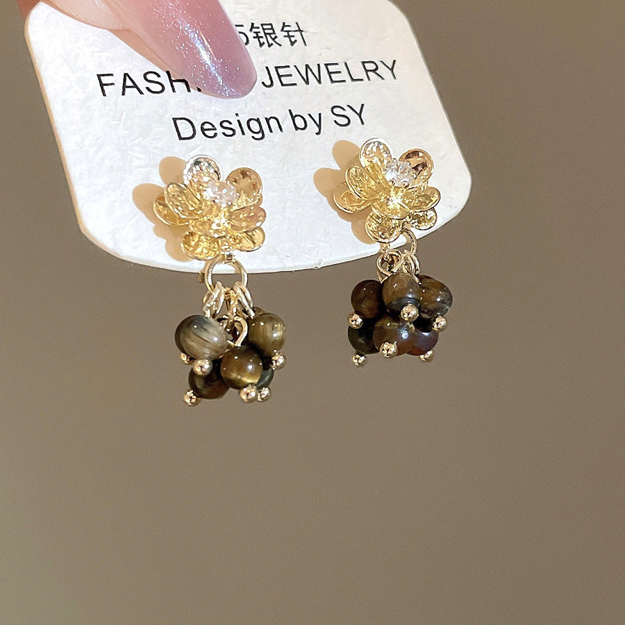 A廠【HE28971】925銀針虎眼石鋯石花朵流蘇吊墜耳環美拉德風耳環輕奢高級感耳飾 25.10-3