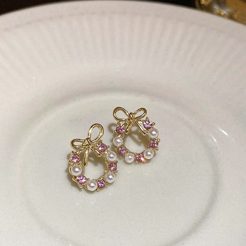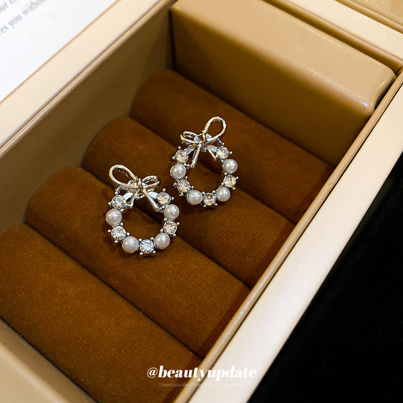 A廠【HE5051】925銀針鑲鑽珍珠圓形蝴蝶結耳環法式簡約輕奢氣質耳環時尚高級感耳飾 24.04-4