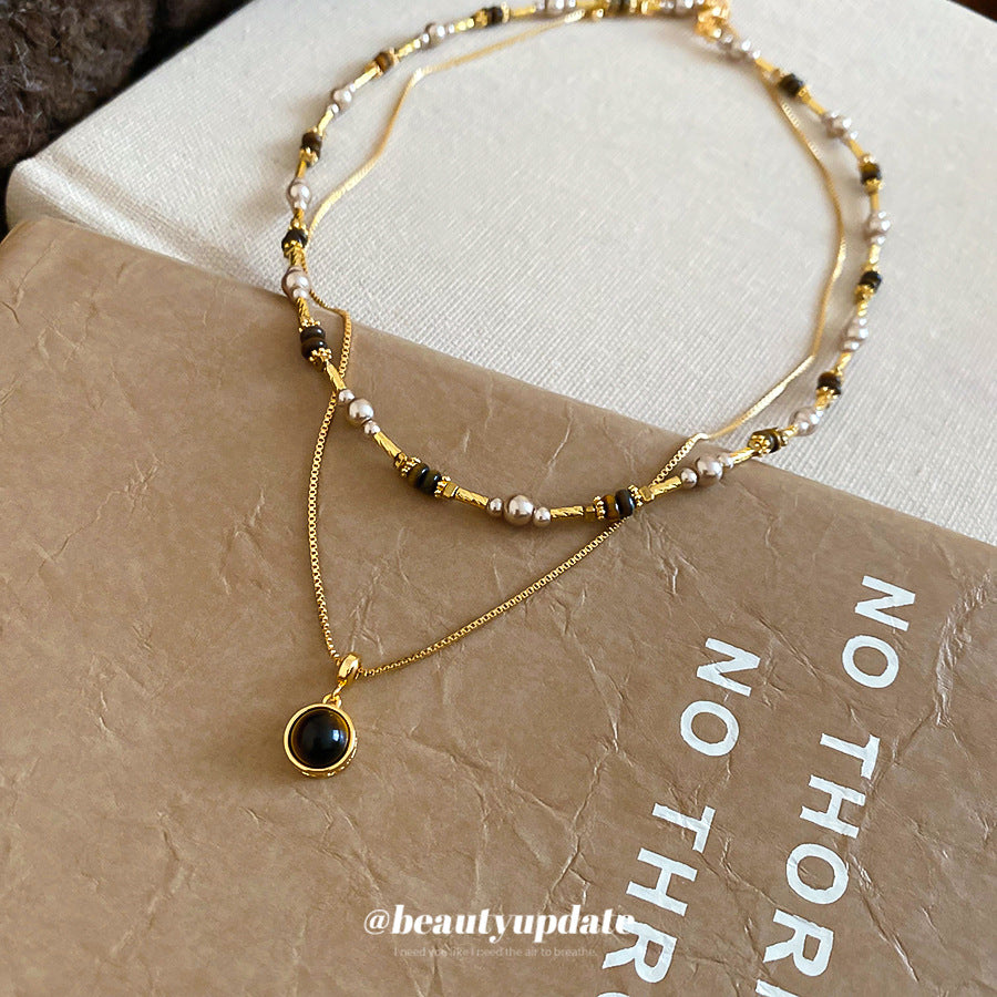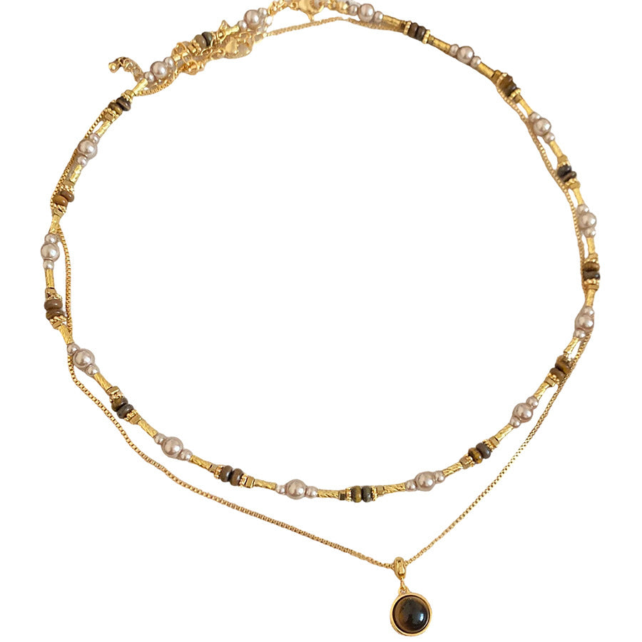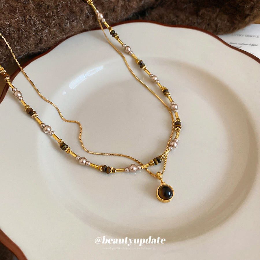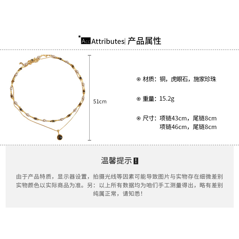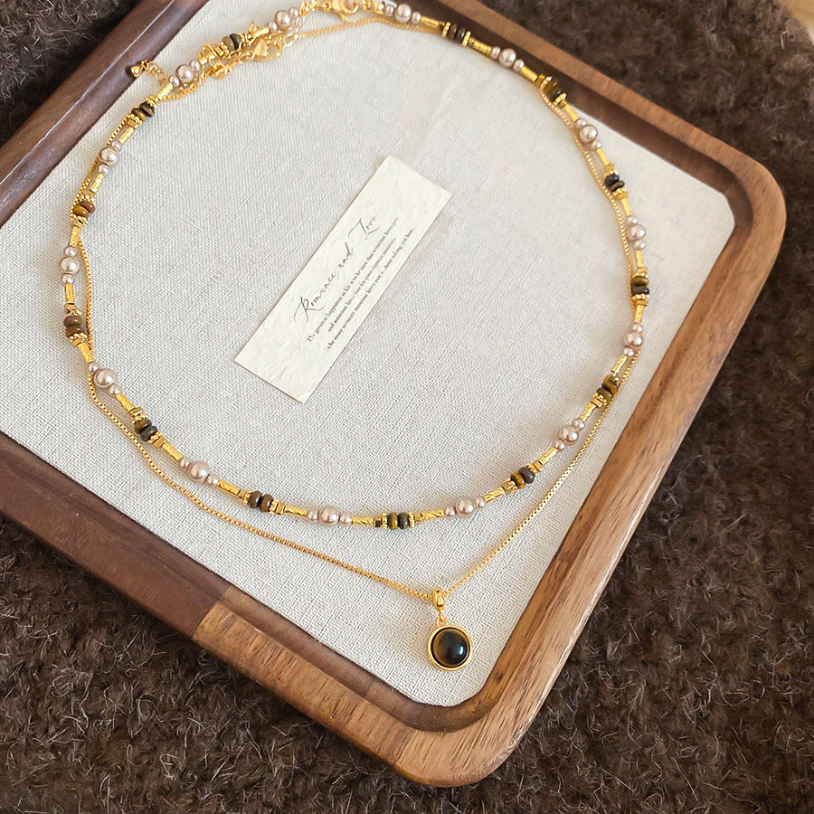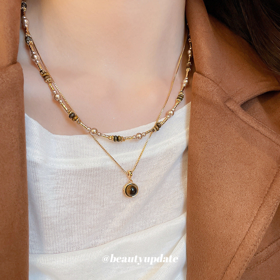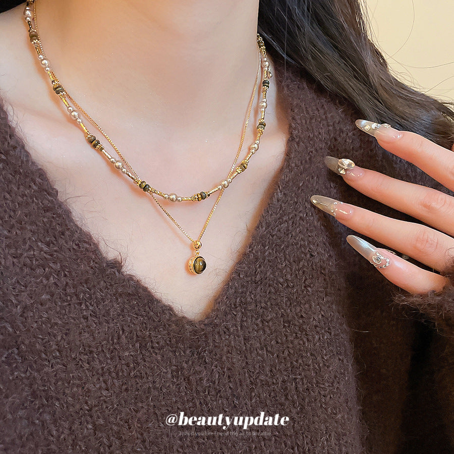 A廠【HN10420】18k真金電鍍虎眼石珍珠串珠項鍊美拉德高級感鎖骨鏈復古國潮頸鍊 25.10-5