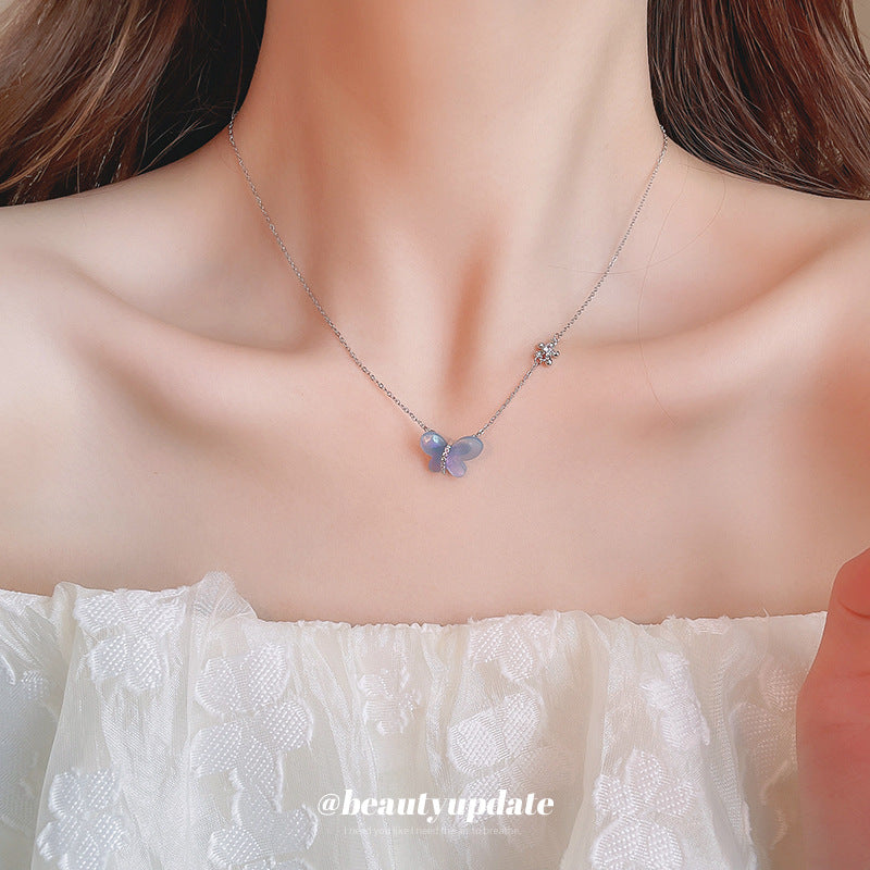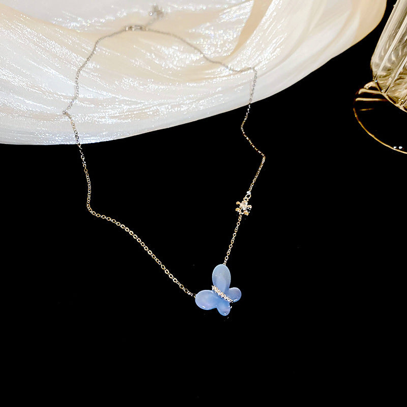 A廠【HN6821】藍色鋯石蝴蝶花朵項鍊手鍊套組時尚簡約氣質鎖骨鏈輕奢高級感飾品 24.07-4