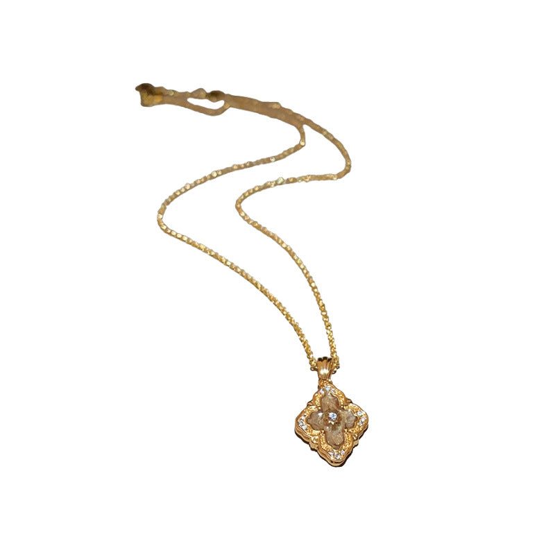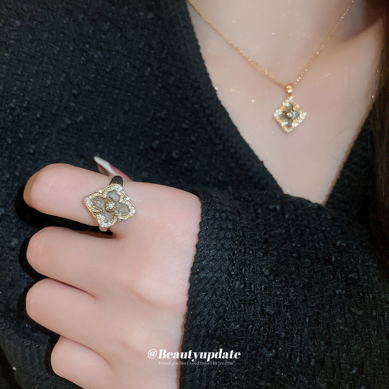A廠【HN7523】真金電鍍中古風鑲鑽花朵戒指項鍊套裝輕奢風鎖骨鏈法式高級感飾品 24.10-2