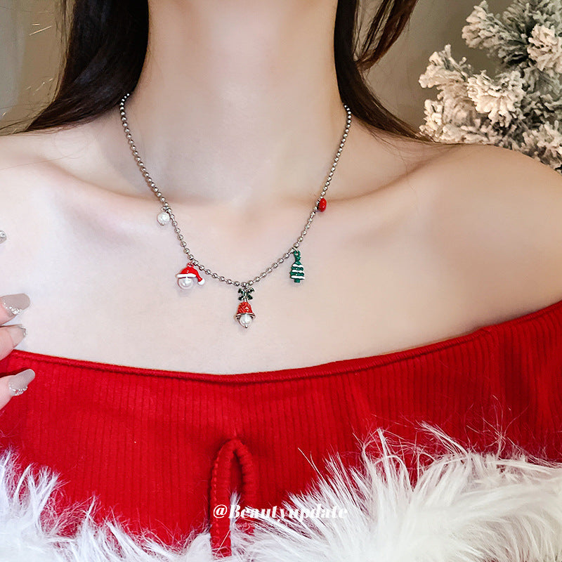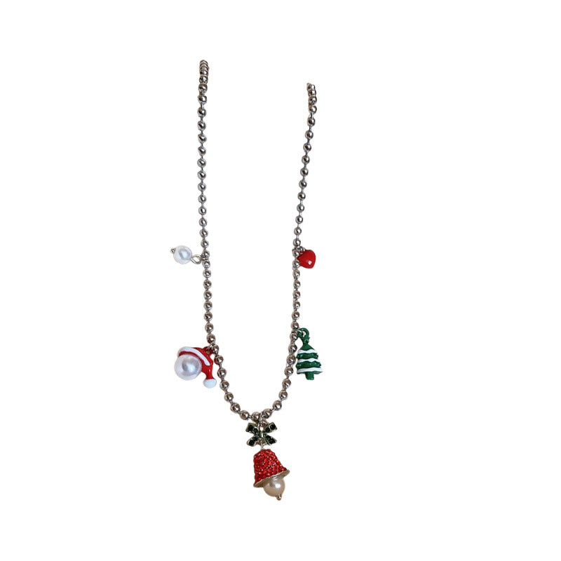 A廠【HN7938】聖誕節鑲鑽鈴鐺聖誕樹珍珠項鍊女甜美時尚鎖骨鏈小眾百搭飾品配件 24.12-1