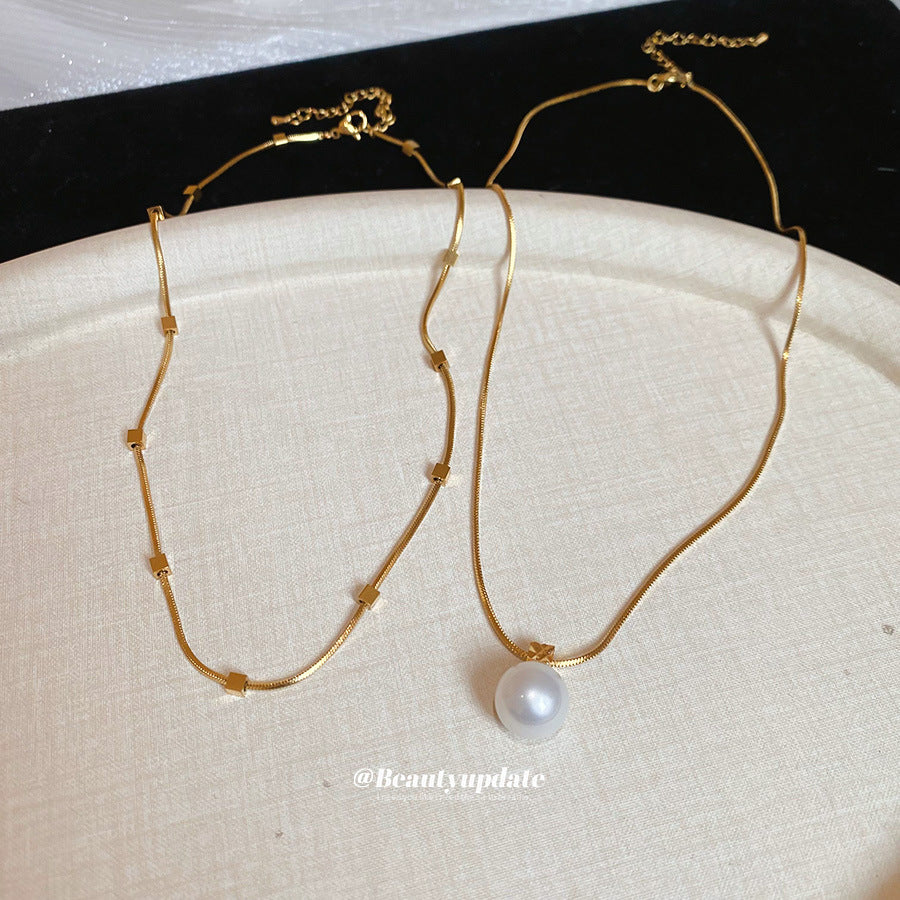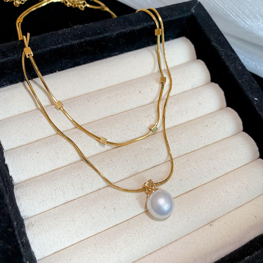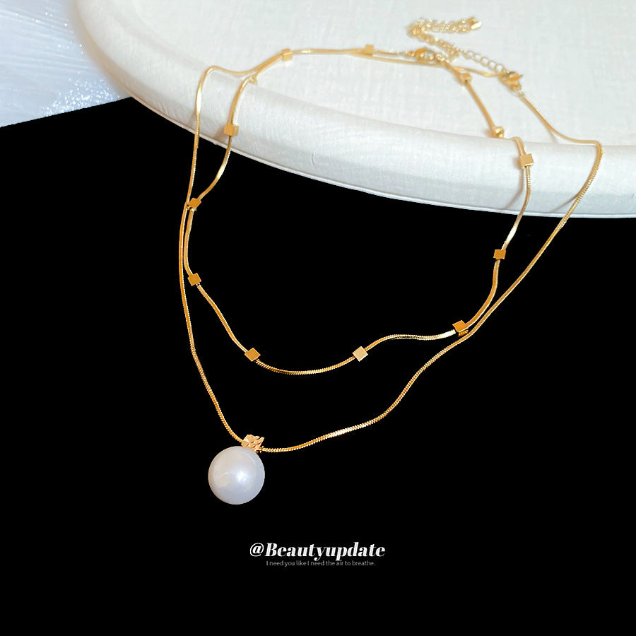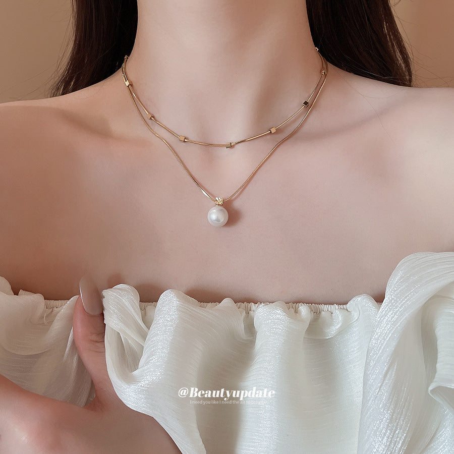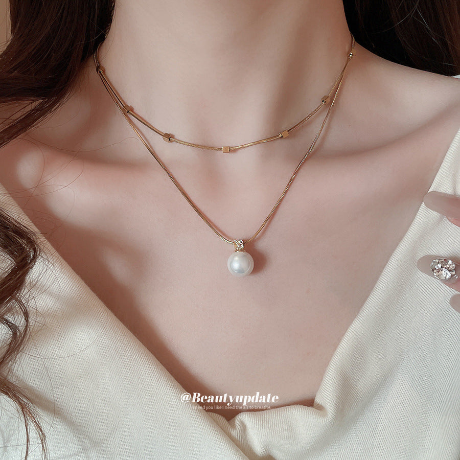 A廠【HN8467】鈦鋼圓形珍珠吊墜雙層項鍊疊戴高級感法式輕奢鎖骨鏈時尚氣質頸鍊 25.04-3