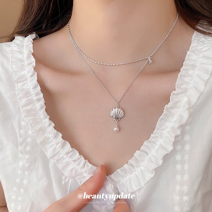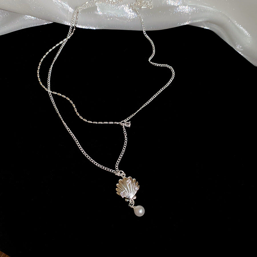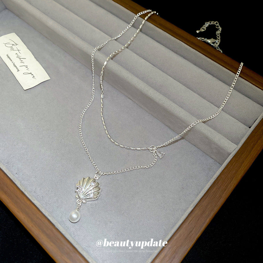 A廠【HN9121】鋯石珍珠貝殼雙層項鍊時尚簡約小眾設計感鎖骨鏈輕奢高級感項鍊女 25.06-3
