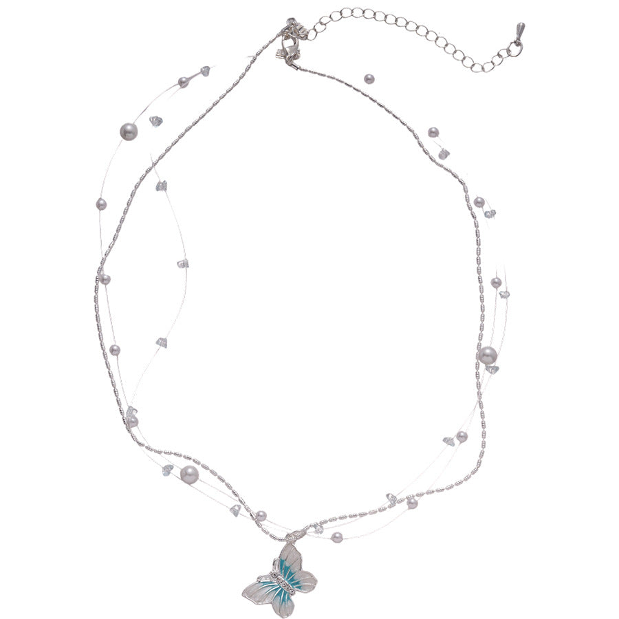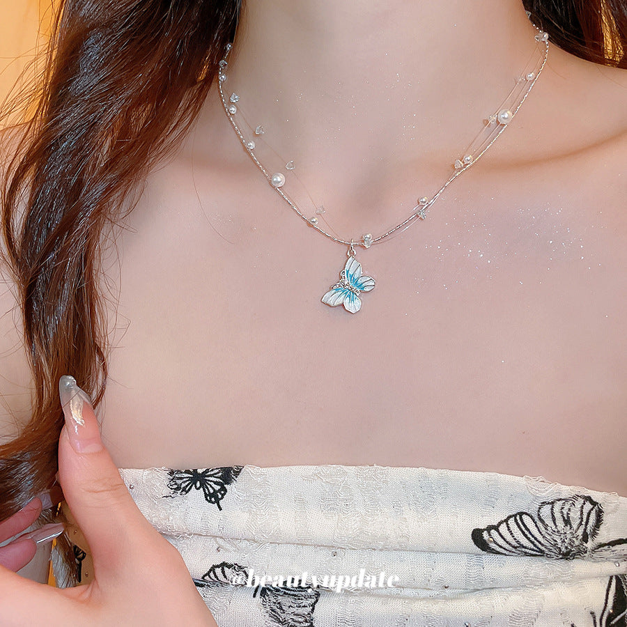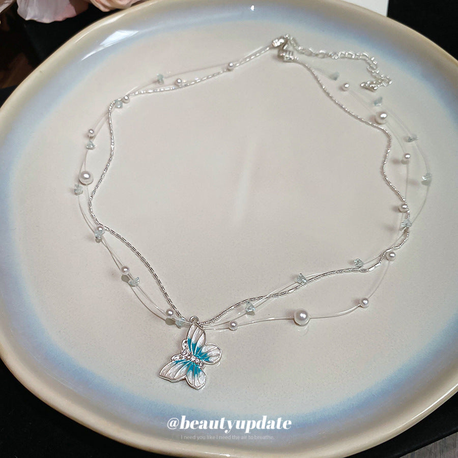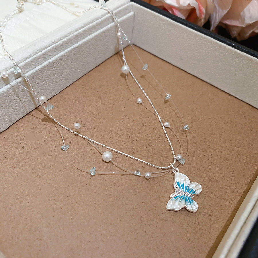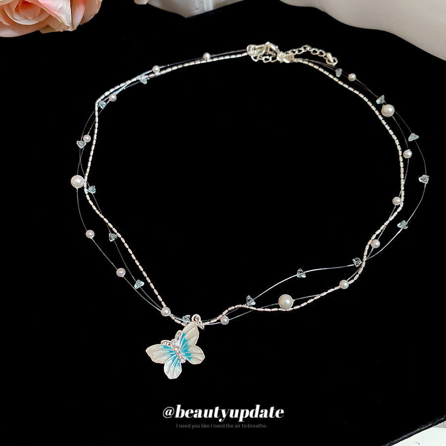 A廠【HN9202】水晶珍珠蝴蝶吊墜三層項鍊小清新小眾少女鎖骨鏈輕奢高級感頸鍊女 25.06-3
