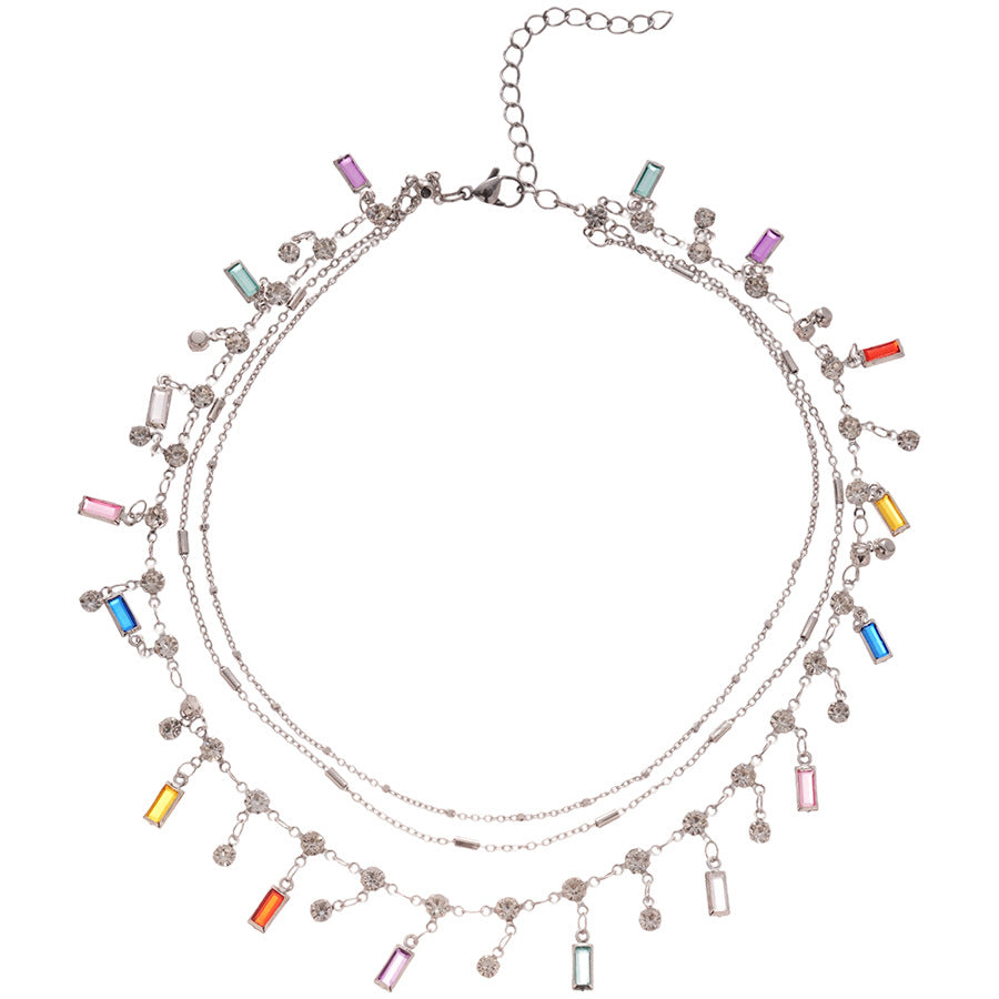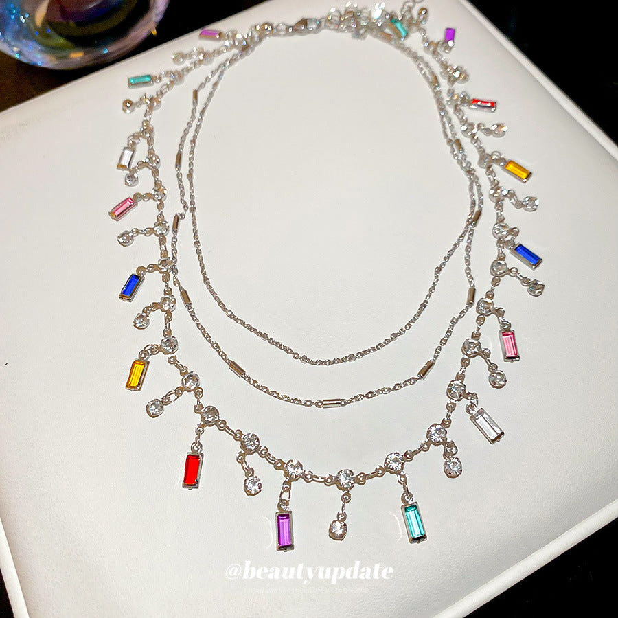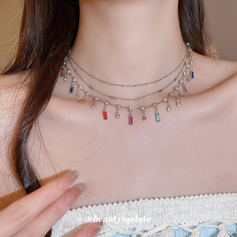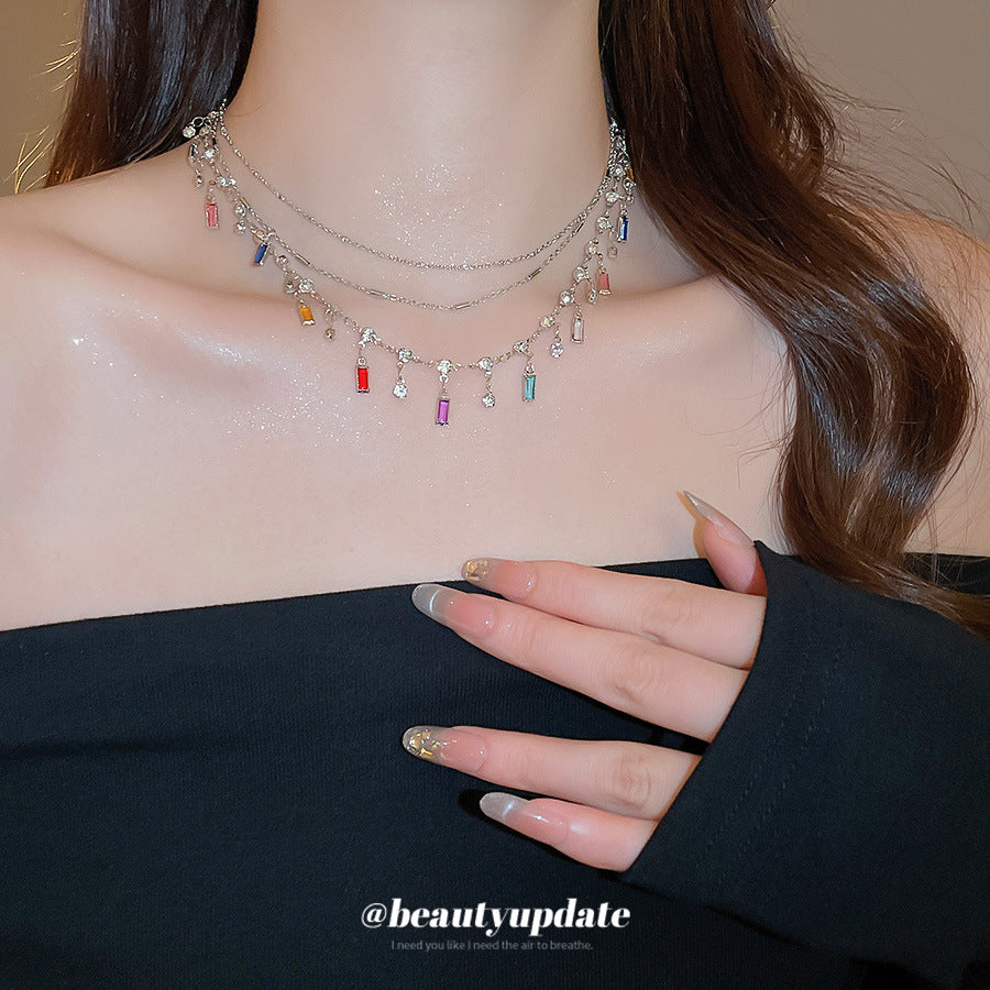 A廠【HN9659】鑲鑽方形水晶流蘇吊墜三層項鍊時尚百搭氣質鎖骨鏈輕奢高級感頸鍊 25.07-4