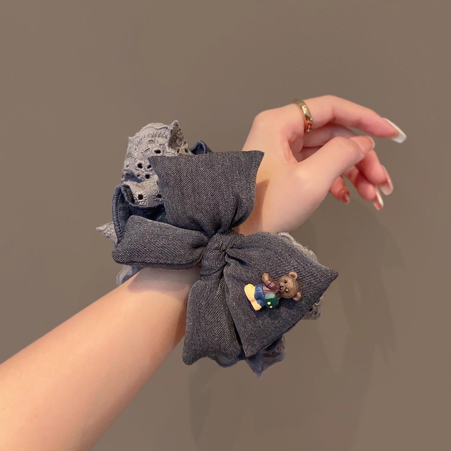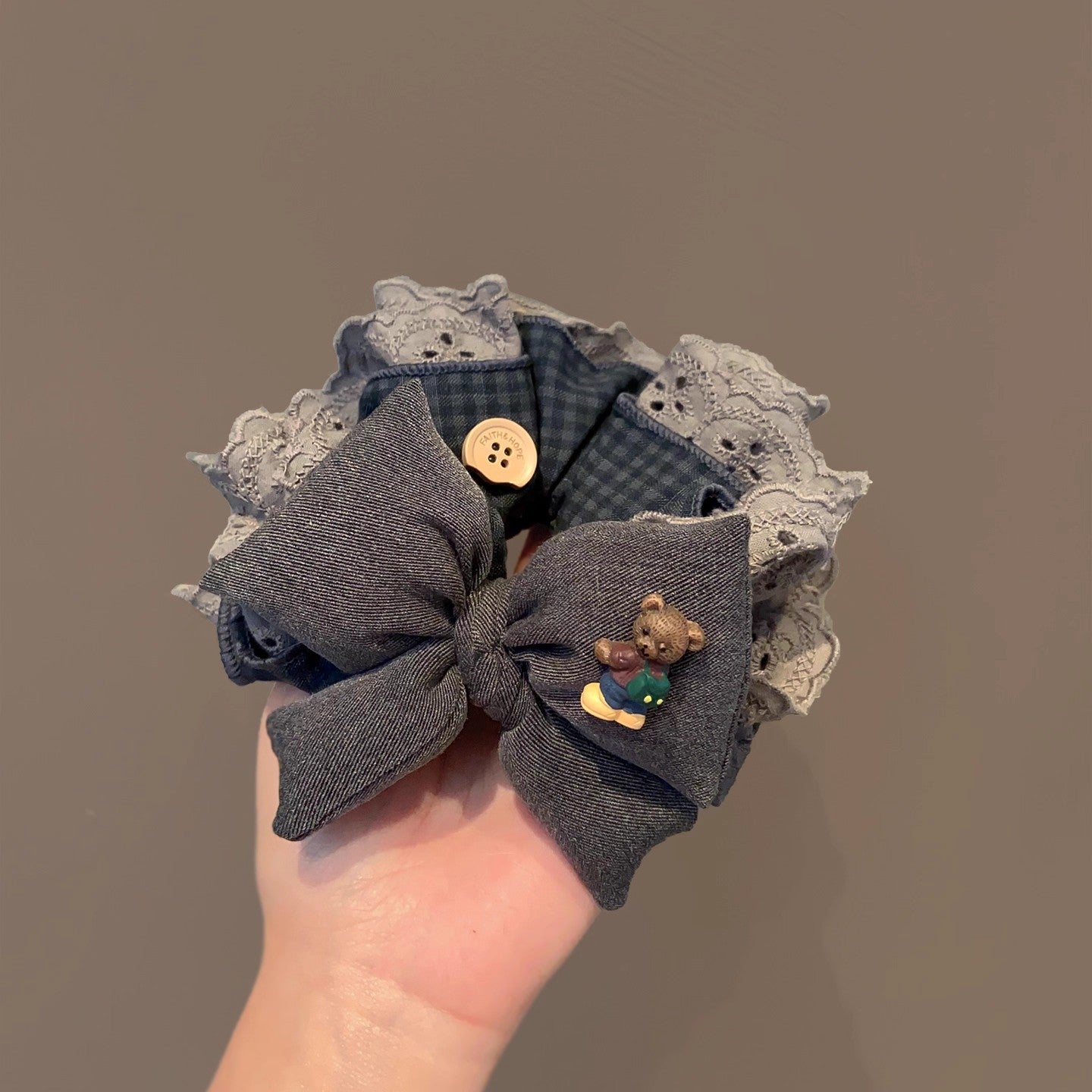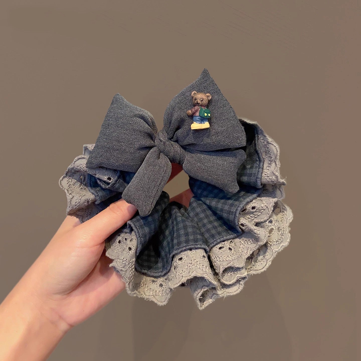 C廠【i21】韓國復古灰色格子蝴蝶結蕾絲大腸髮圈女超大丸子頭低馬尾頭繩頭飾 25.12-4「C廠-單筆結帳需滿,NT$500出貨(不含運費)」