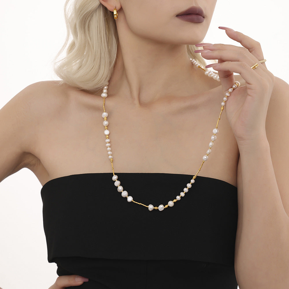 B廠【M056】法式精選淡水珍珠長不鏽鋼毛衣鏈爆閃輕奢鎖骨項鍊首飾女 24.12-1