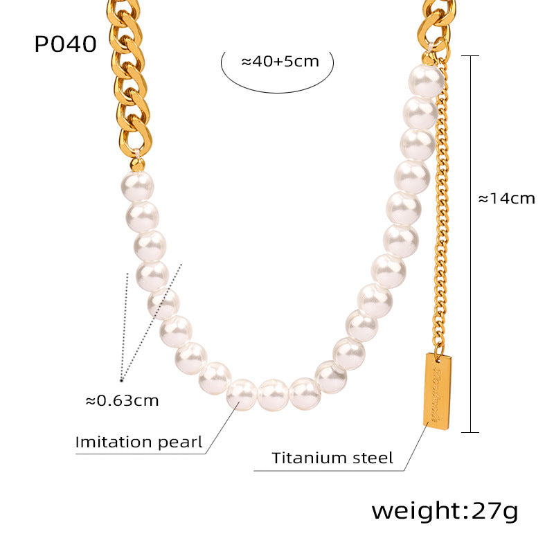 B廠【P040】法式復古風仿珍珠鈦鋼拼接項鍊時尚設計感幾何方形流蘇鍍真金飾品 24.01-3