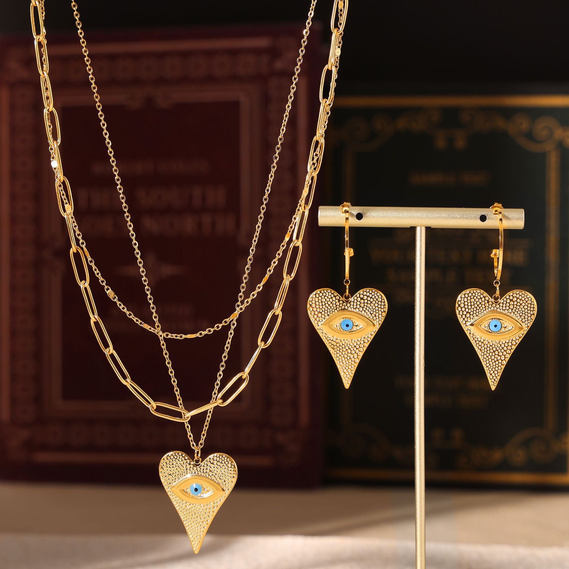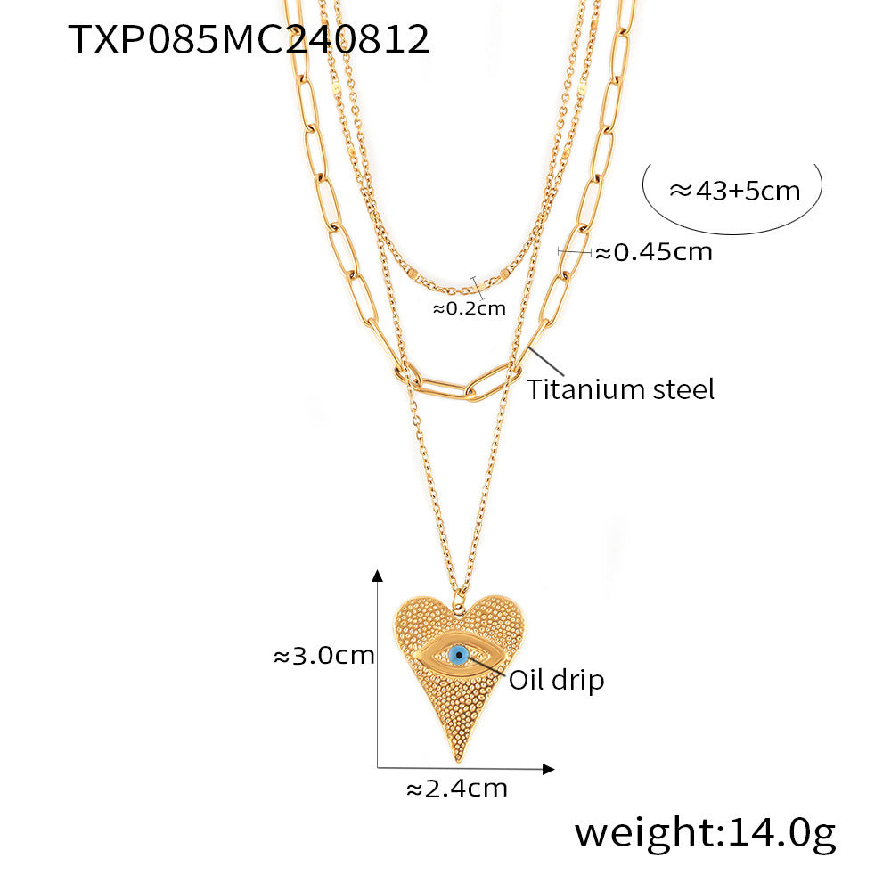 B廠【P085】熱銷歐美風心形惡魔之眼吊墜耳環多層項鍊鈦鋼鍍18k真金時髦套裝 24.08-3