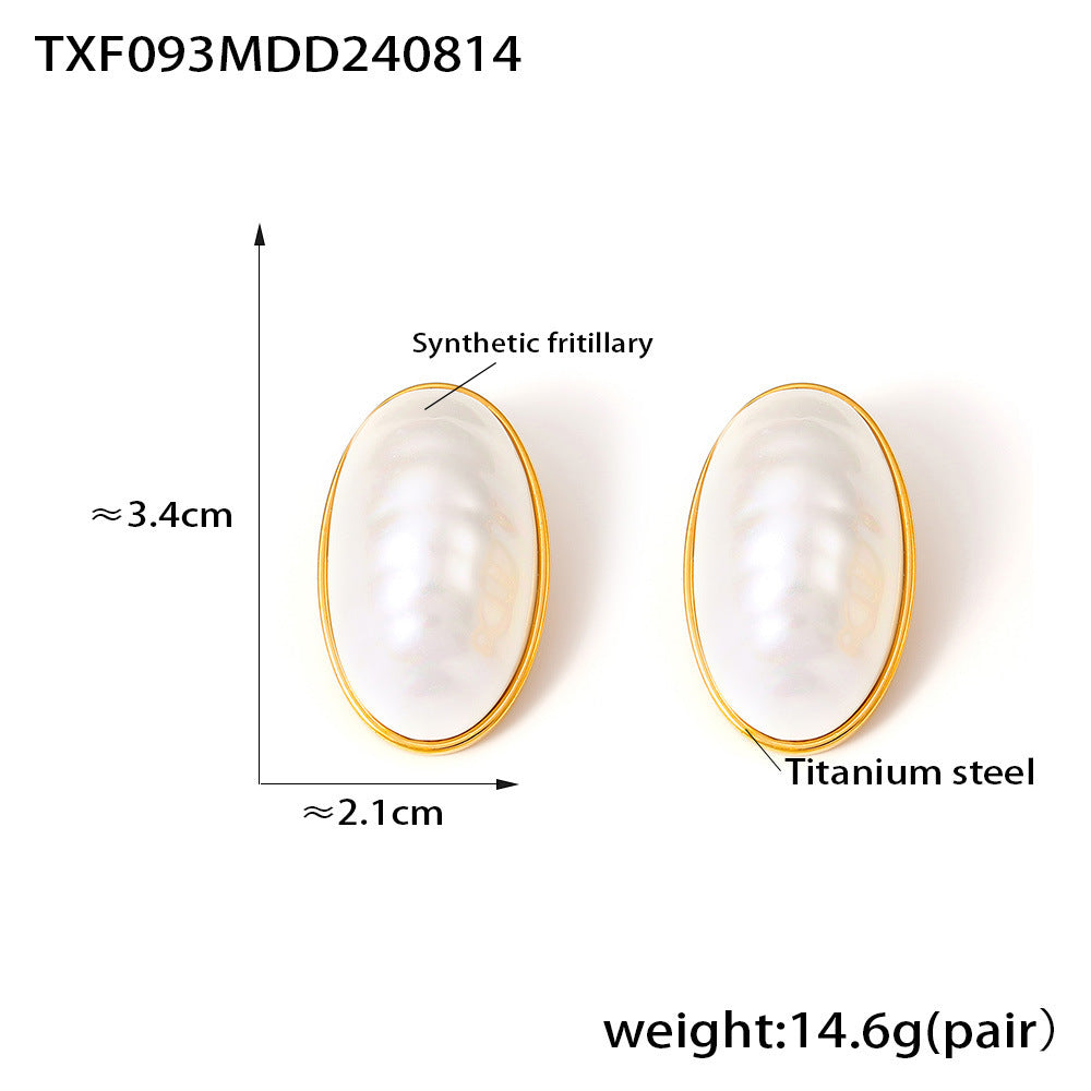 B廠【P093】法式marka橢圓貝母吊墜鎖骨項鍊戒指耳環鈦鋼鍍18k真金輕奢感套裝 24.08-4
