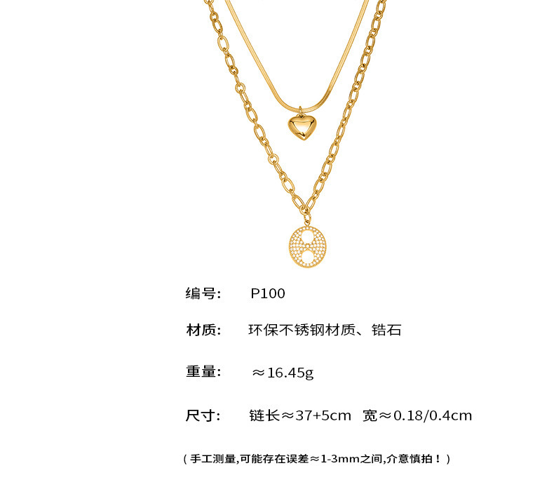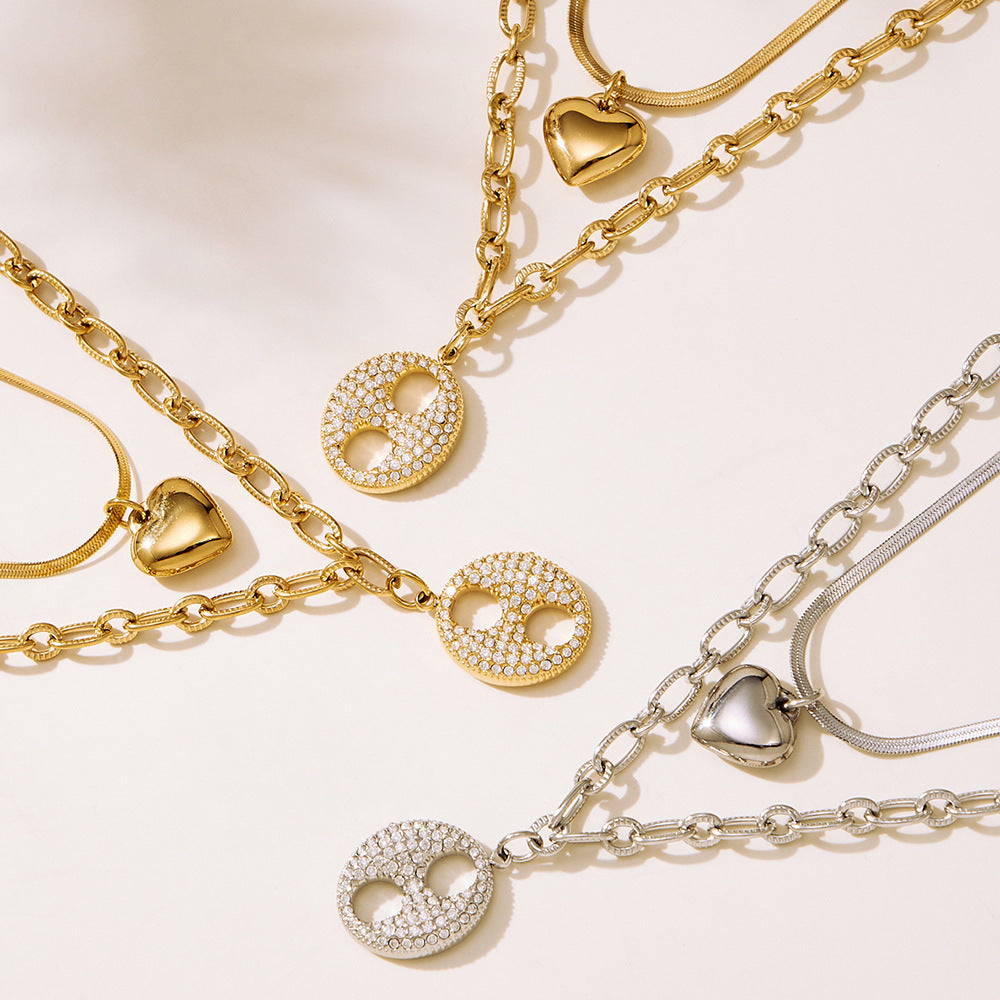 B廠【P100】 不鏽鋼雙層疊戴愛心豬鼻子鋯石項鍊 鍍18k金歐美百搭項鍊 25.11-3