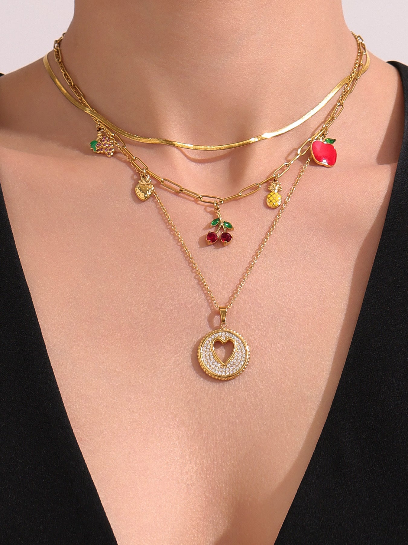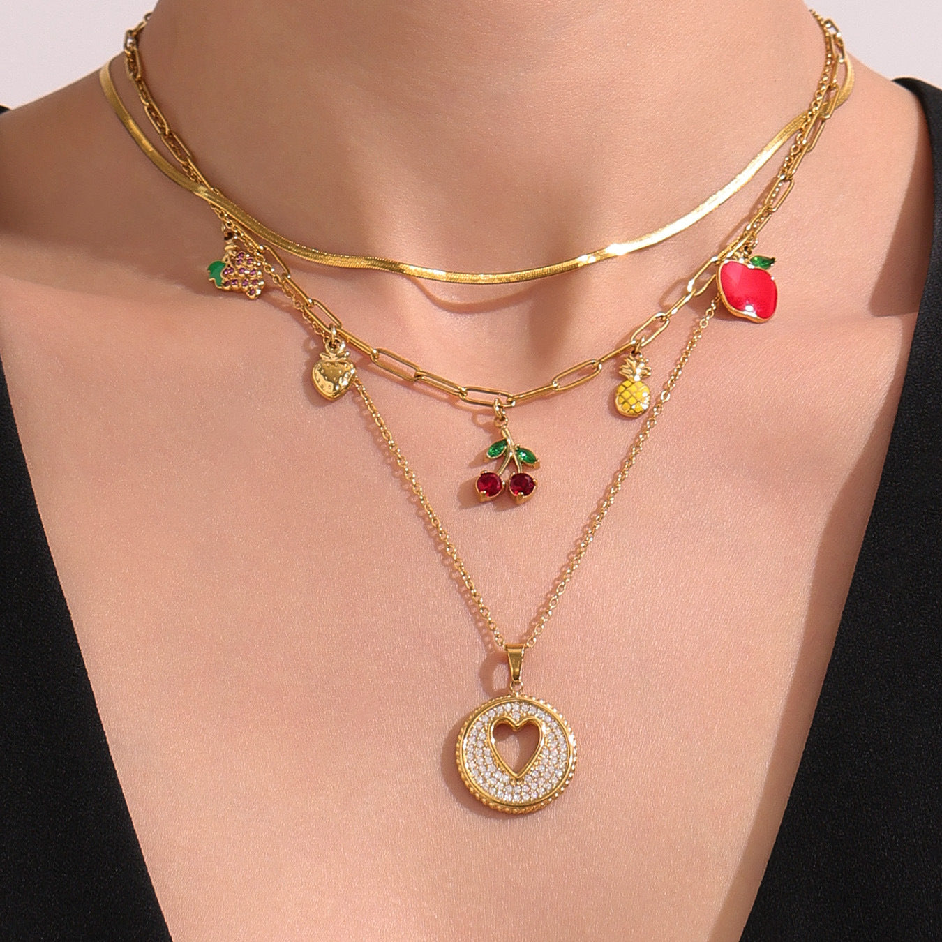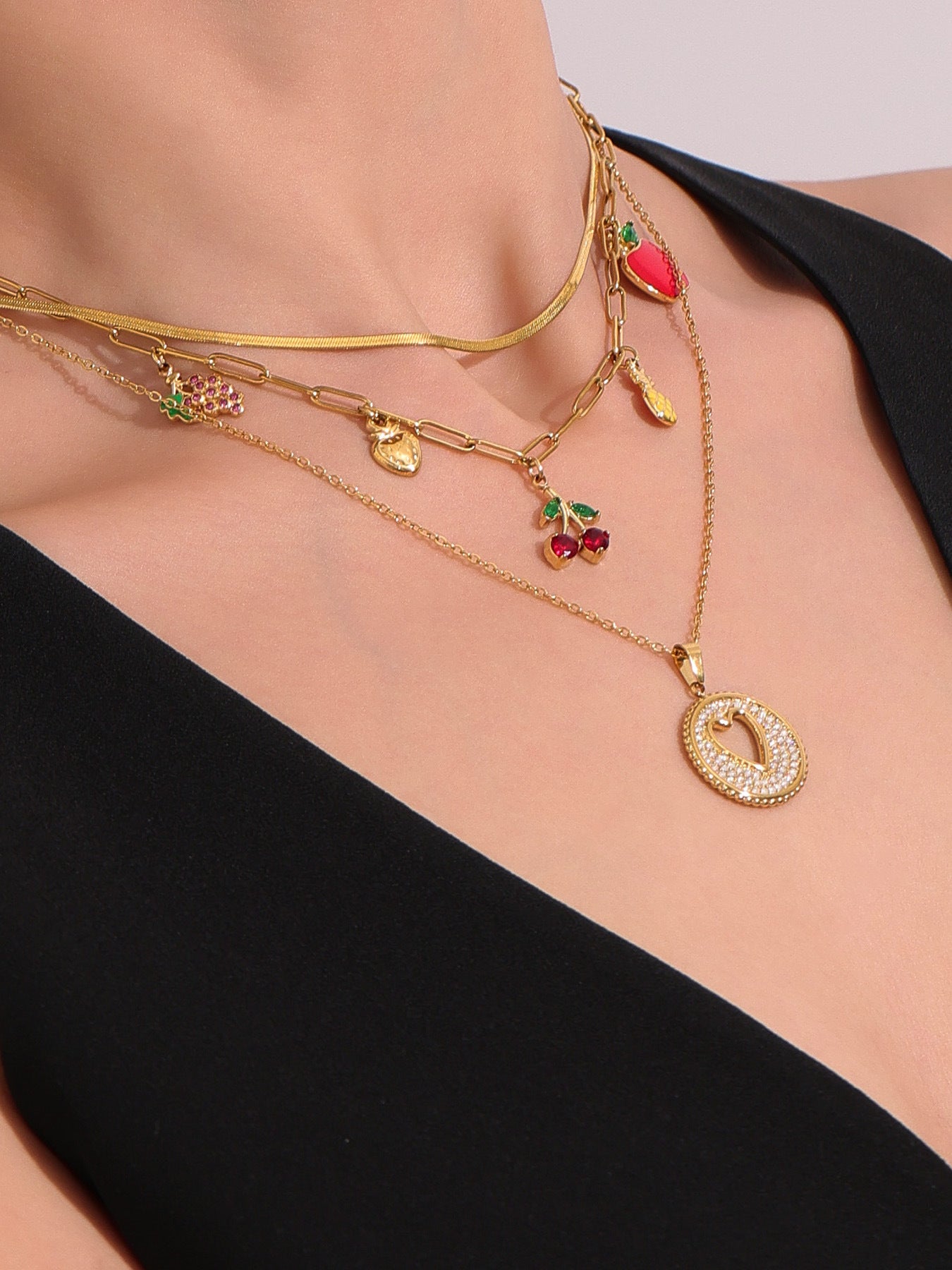 B廠【P1053】歐美時尚飾品不鏽鋼水果造型5A紅鋯石多配件鎖骨鏈滴油項鍊 25.08-2