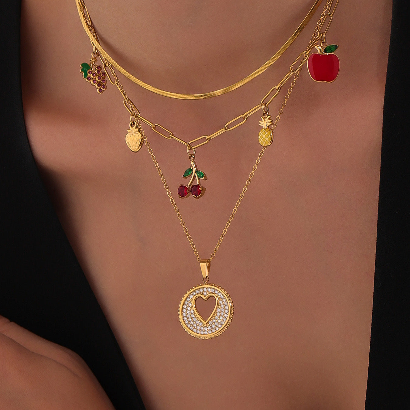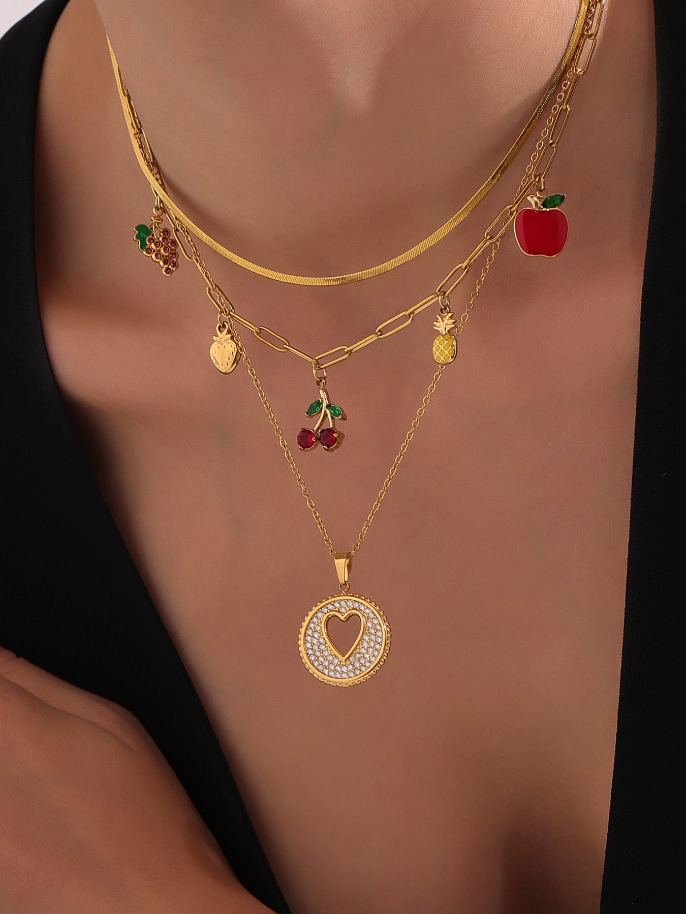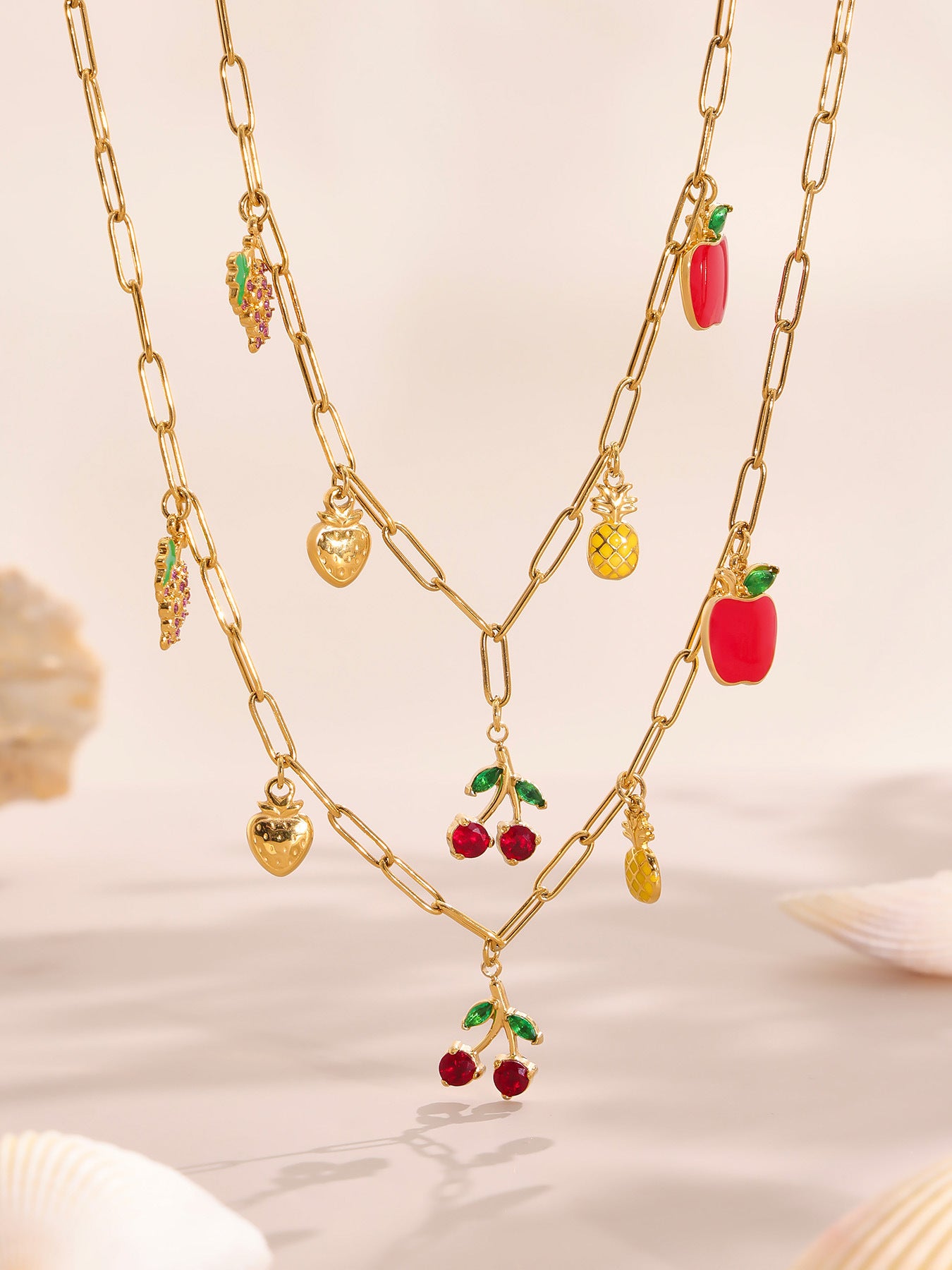 B廠【P1053】歐美時尚飾品不鏽鋼水果造型5A紅鋯石多配件鎖骨鏈滴油項鍊 25.08-2