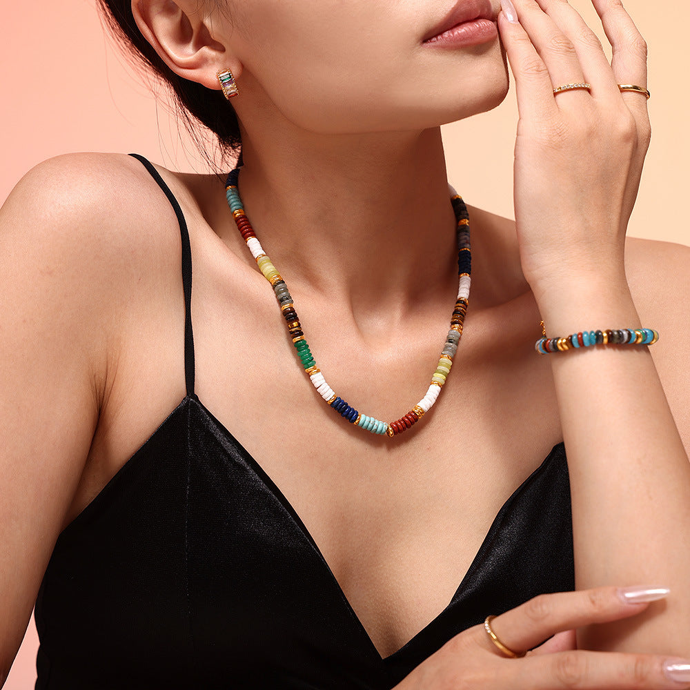 B廠【P128】多巴胺天然石算盤珠項鍊手鍊項鍊復古風輕奢手工彩虹串珠首飾套裝 24.09-3