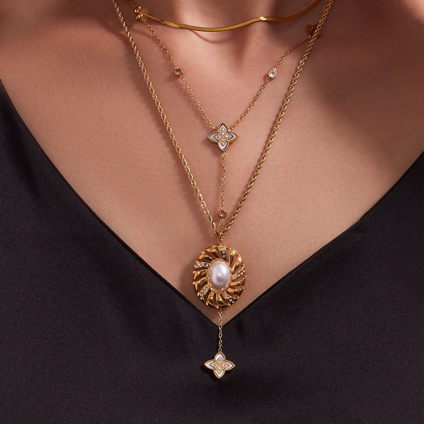 B廠【P155】不鏽鋼四葉花Y字流蘇鎖骨鏈鍍18k金精緻仿珍珠疊戴項鍊組合 25.09-4