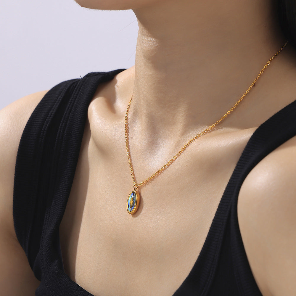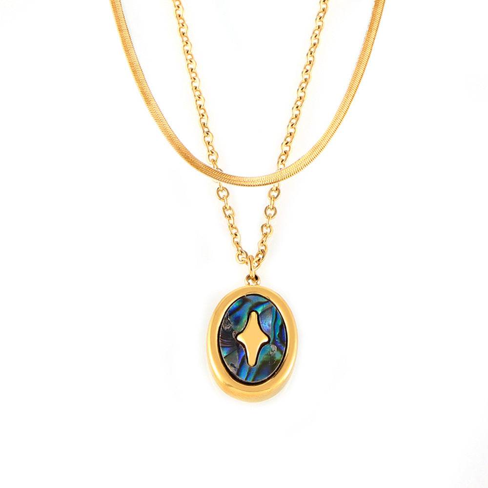 B廠【P1867】法式跨境十字光芒橢圓形七彩真貝殼吊墜鈦鋼鍍金項鍊小眾氣質飾品 24.07-2