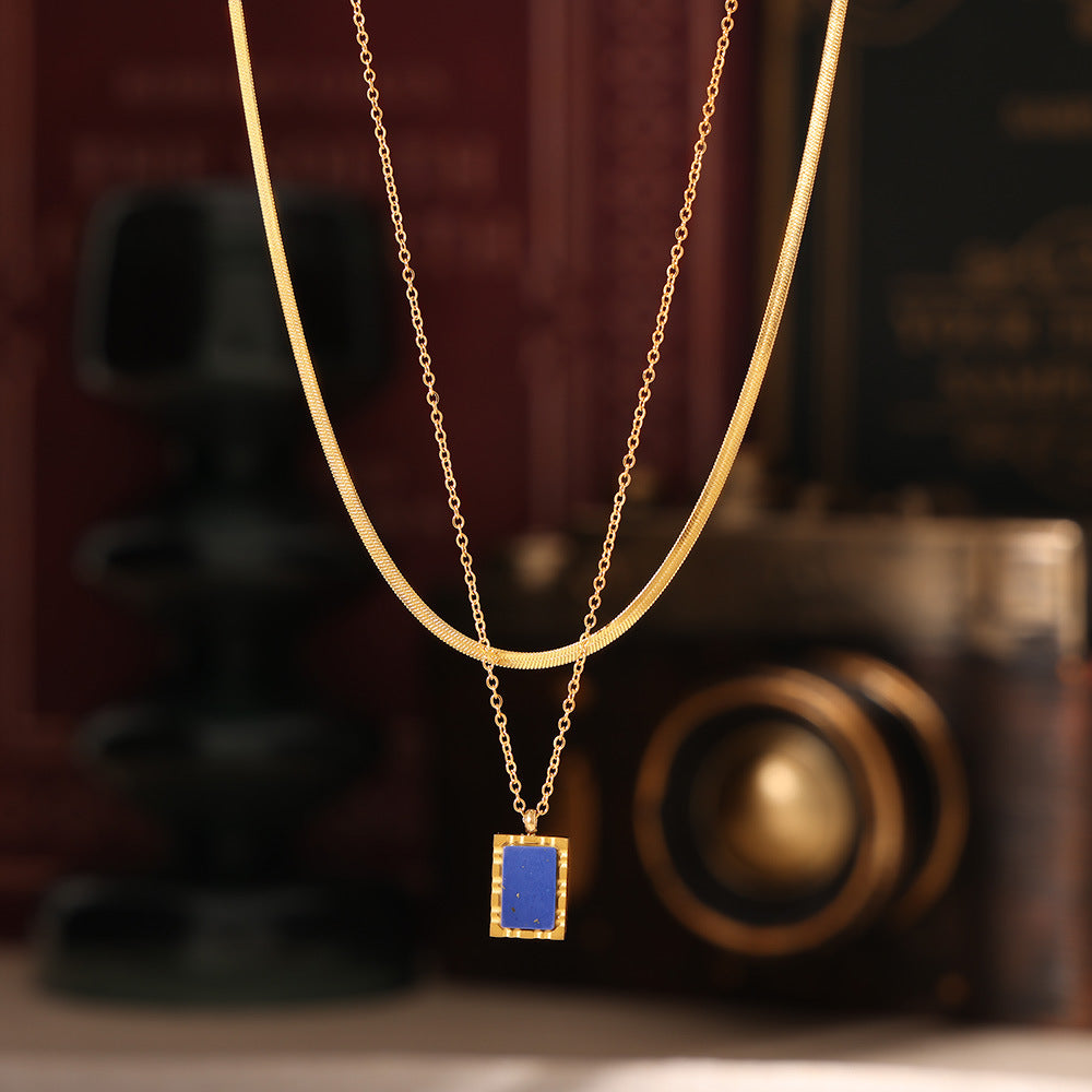 B廠【P2017】法式復古天然藍色青金石幾何方牌鎖骨鏈 鈦鋼鍍18K金不掉色疊戴風 24.08-3