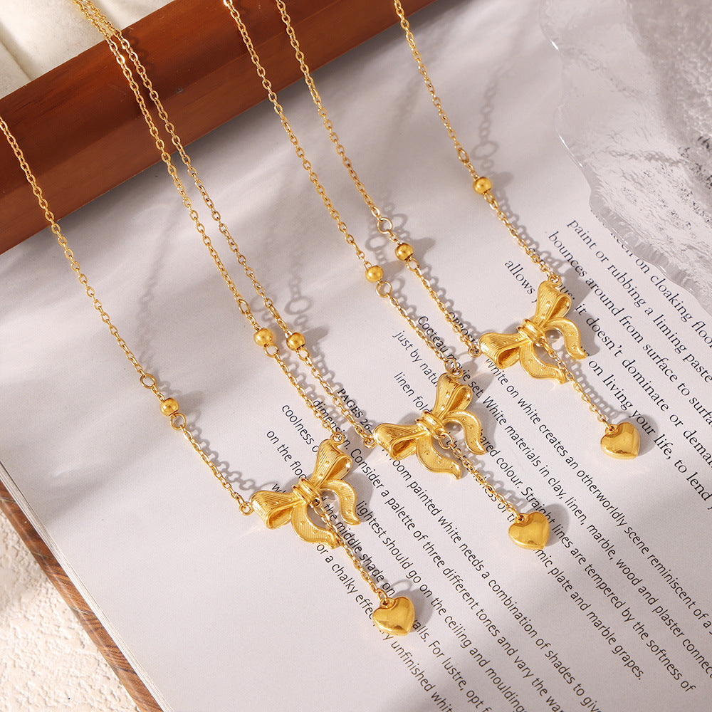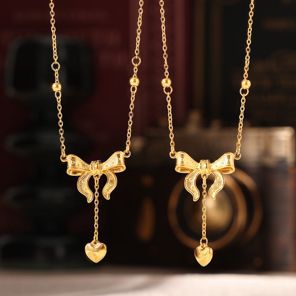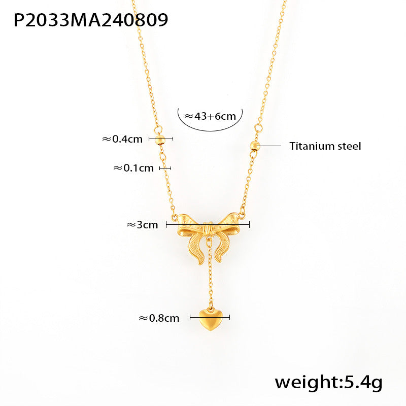 B廠【P2033】歐美chic風愛心流蘇蝴蝶結鎖骨項鍊甜美風女式項鍊鈦鋼鍍18k真金 24.08-3