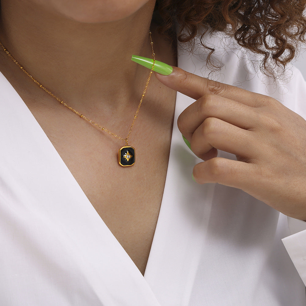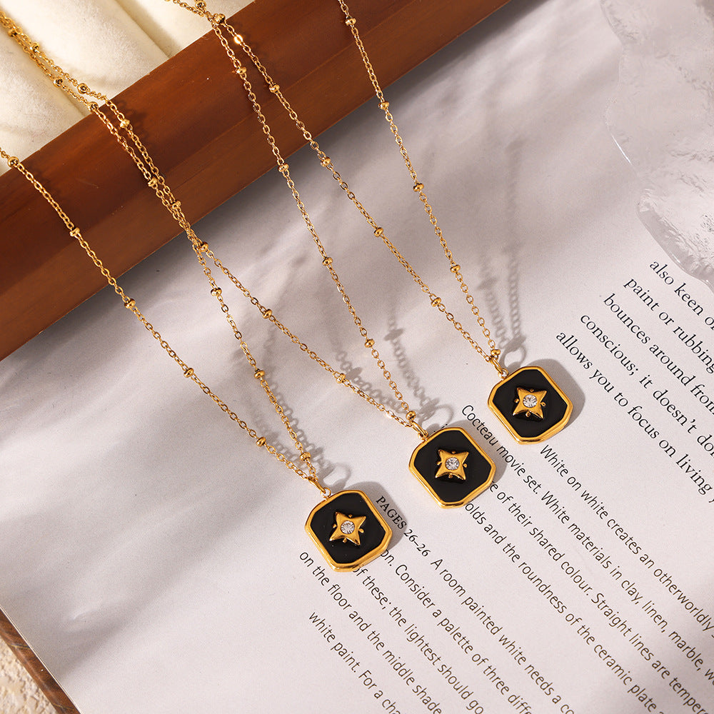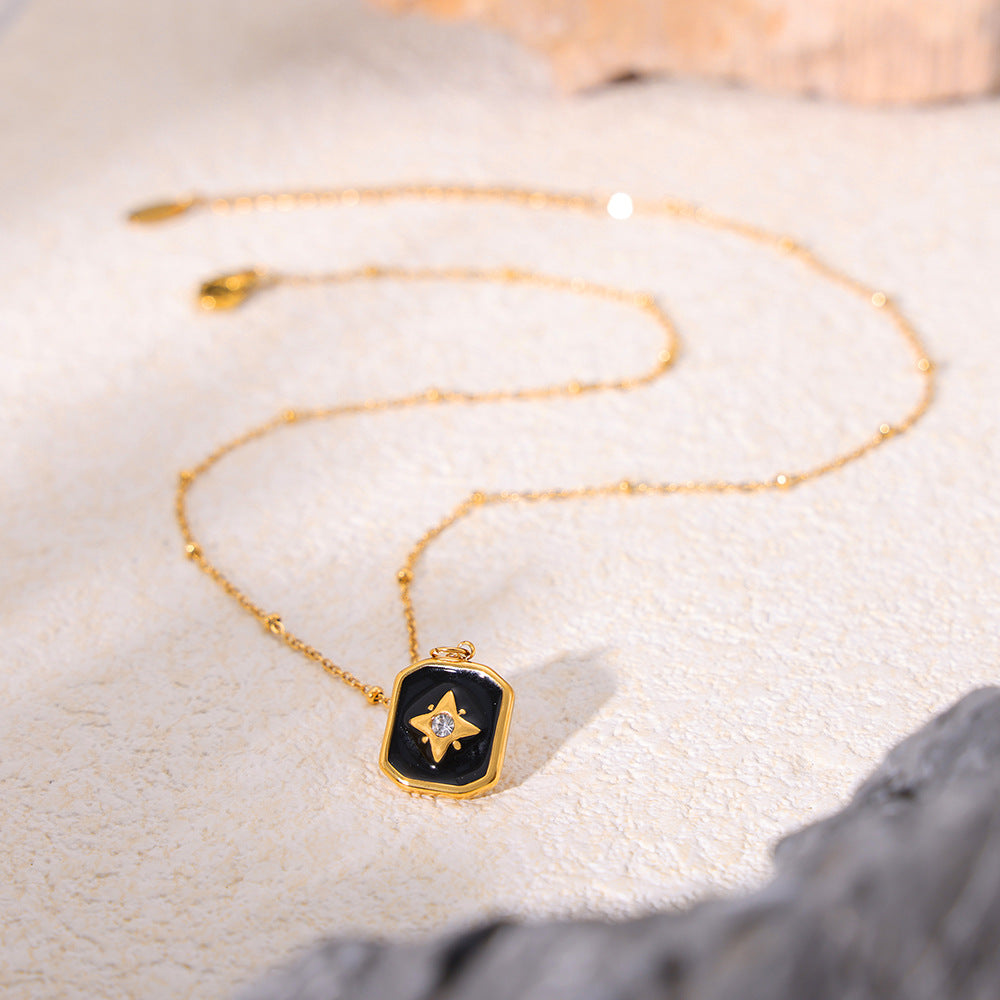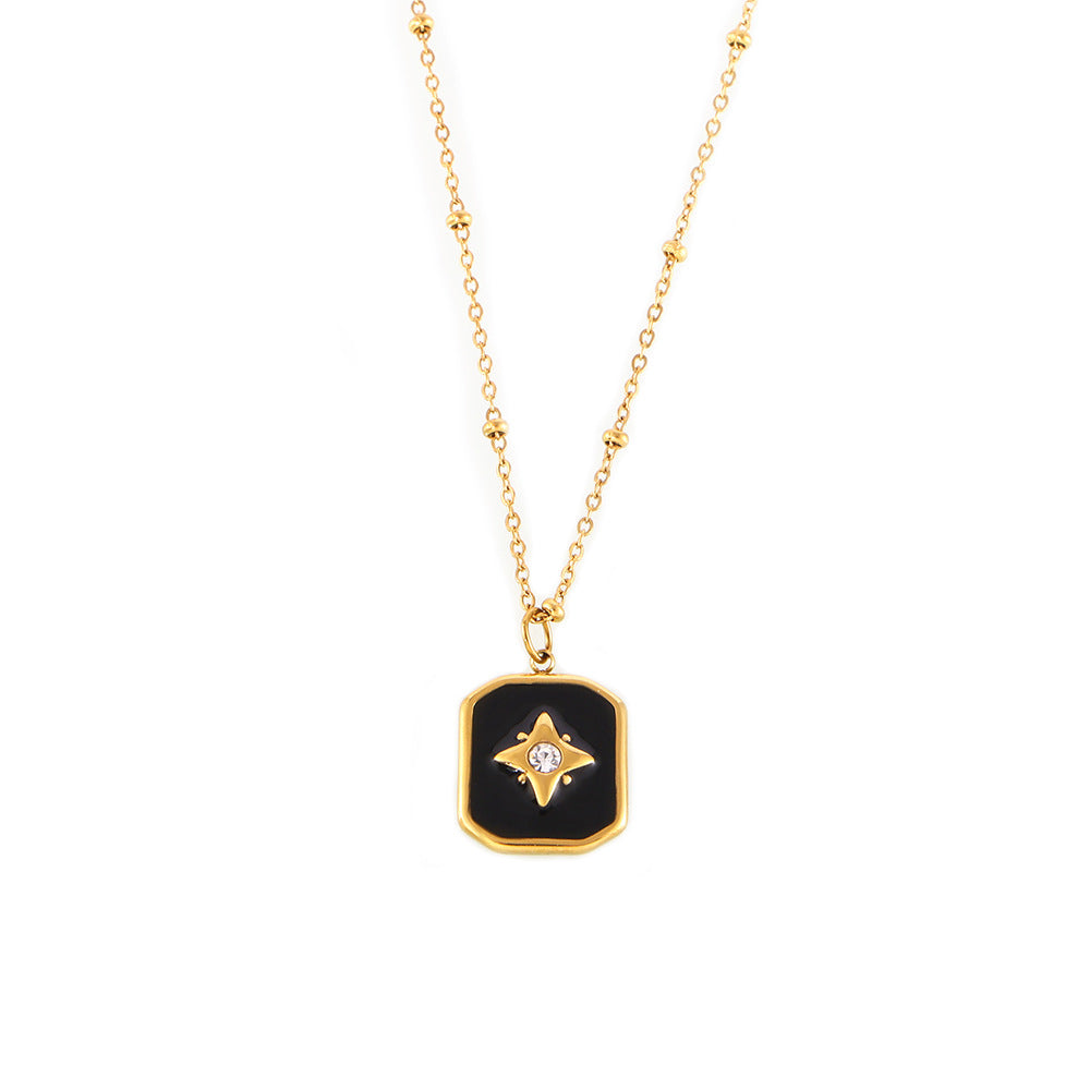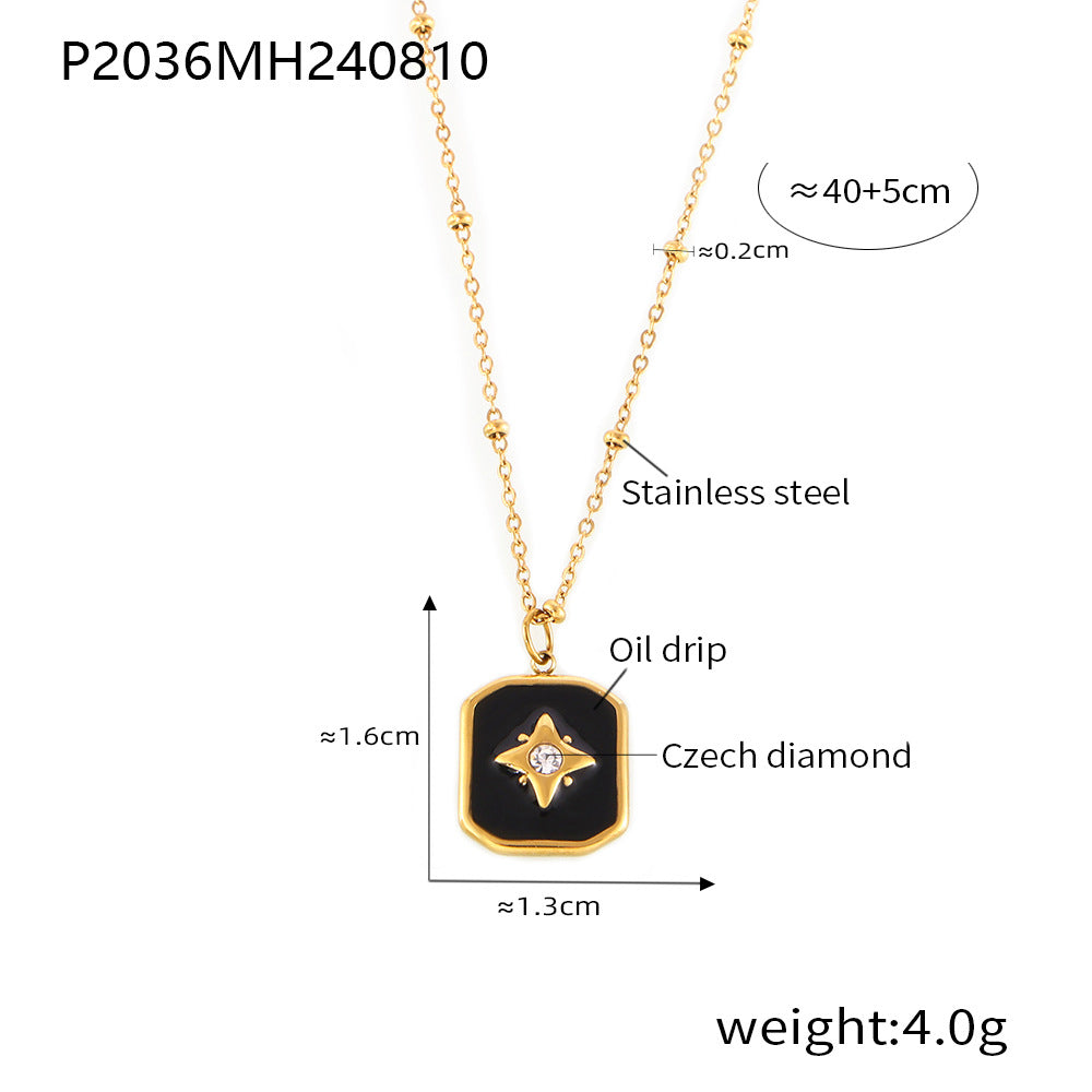 B廠【P2036】歐美風跨境復古黑壓克力滴油鑲鑽星星方牌項鍊不鏽鋼鍍金通勤飾品 24.08-3