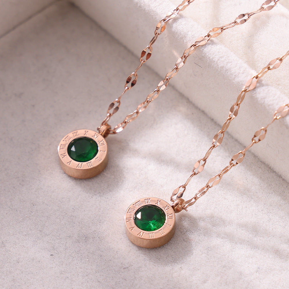 B廠【P2042】歐美玫瑰金羅馬文祖母綠圓玻璃石吊墜項鍊女復古輕奢感鈦鋼鎖骨鏈 24.08-3