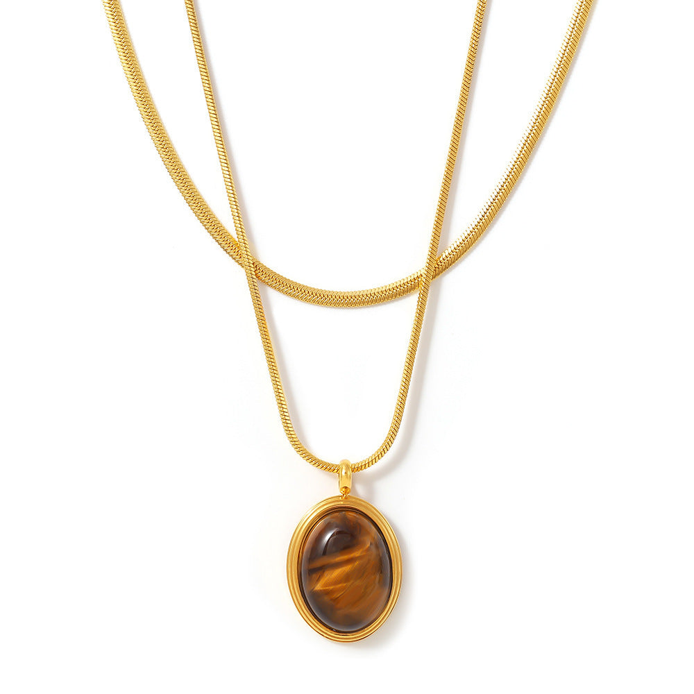 B廠【P2052】歐美熱銷秋冬雙層疊戴橢圓虎眼石吊墜項鍊跨國輕奢不鏽鋼材質頸鍊 24.10-1
